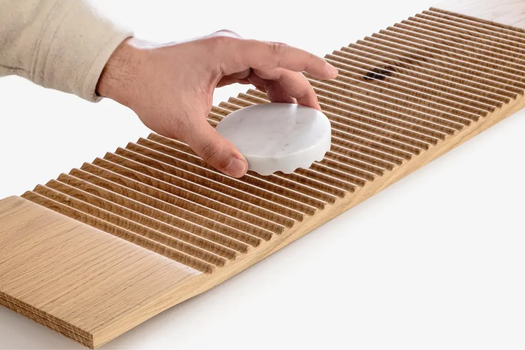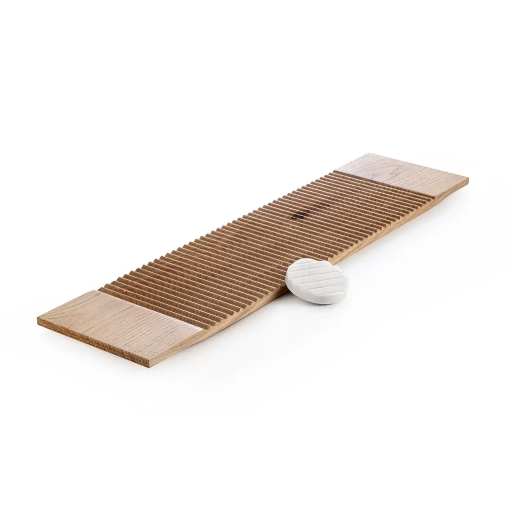T4 BATHROOM FURNITURE COLLECTIONThe bathroom collection, which includes TOTO - washbasin, TINA - stool/container and TITO - bathtub shelf, was born from the memory of the nearest past. A time not long ago when ancient wash houses were vital hubs of small Mediterranean communities. The three elements play with characteristic signs, combining marble and wood. They are symbolic of toil and emotion, shaping three evocative forms inspired by the rural objects and architecture around which life moved. Tactile, sinuous and functional lines that transform research into objects that give us back the atmosphere and traces of territories that are part of our history, projected into the future.TITO, BATHTUB SHELFA bathtub shelf intended as a synthesis of an ancient object, the clothes washer, whose traces mark the horizontal dimension of the object. TITO is a fluted wooden board with a circular marble detail to create a textural difference-a complement totally dedicated to the relaxing dimension of the bathroom.TITINO, SOAP DISHA marble accessory designed for bathroom furniture that enhances the multiple functionalities created by alternating the different surfaces of the object.Extra customizations available upon request.