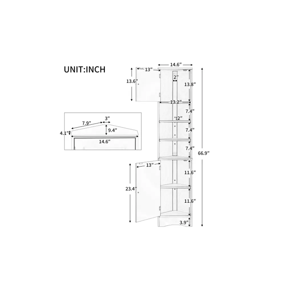 More Information Color Grey Material MDF board Shape Triangle (Trapezoid) Capacity 15lbs each shelf Adjustable Shelf Yes Number of Drawers 0 Number of Doors 2 Anti-dumping Device Yes Package Include Cabinet, hardware, instruction Country of Origin China Certificate TSCA