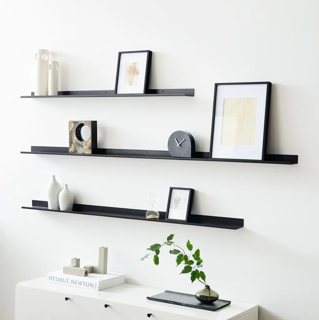Deep enough to hold vases or other decorative objects, our Trace shelves have a minimalist feel, courtesy of its sleek design. Turned-up edges help keep your picture frames and décor in place. Use one on its own or several to create a versatile gallery. Handcrafted in Minnesota, these shelves are offered in a range of timeless colors, which are produced by powder-coating steel for a durable, smooth finish.