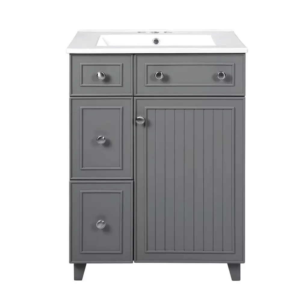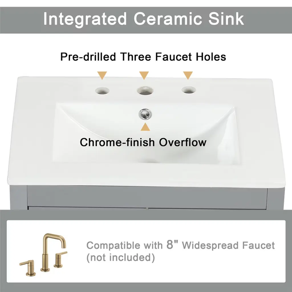 This luxury bathroom vanity features a high-quality ceramic sink with a smooth, waterproof finish that resists stains and water spots. The pre-drilled three-hole design accommodates an 8" widespread faucet (sold separately), while the overflow metal ring prevents spills. The solid rubber wood frame and MDF construction ensure durability in humid environments, making it both sturdy and stylish.