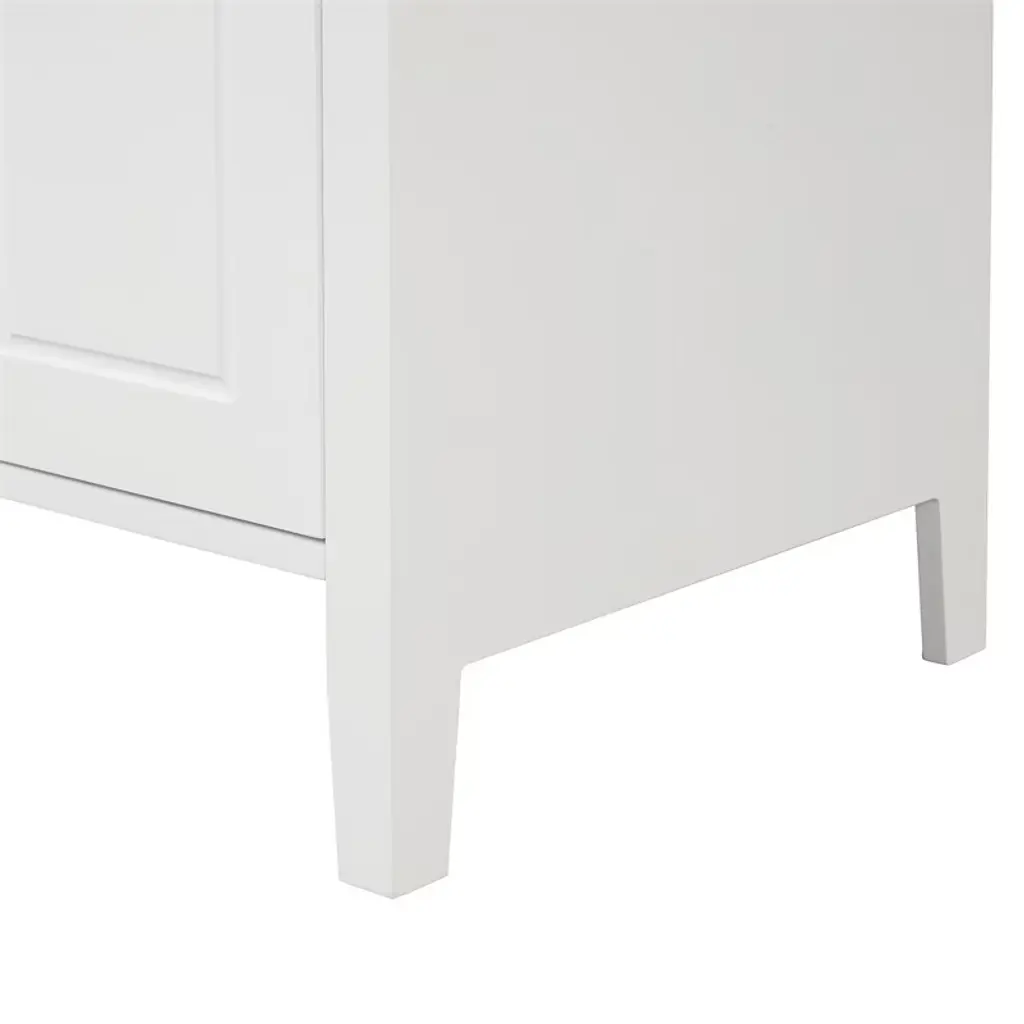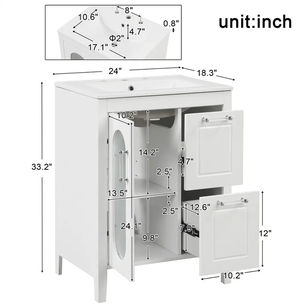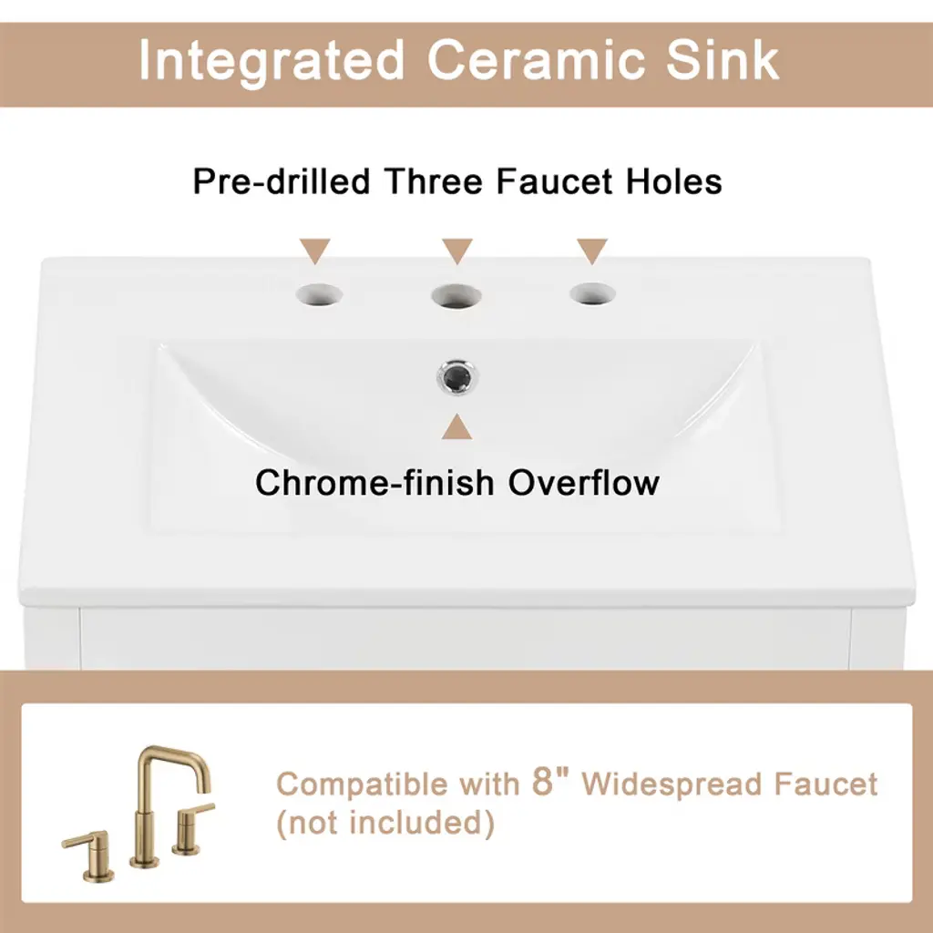This luxury bathroom vanity features a high-quality ceramic sink with a smooth, waterproof finish that resists stains and water spots. The pre-drilled three-hole design accommodates an 8" widespread faucet (sold separately), while the overflow metal ring prevents spills. The solid rubber wood frame and MDF construction ensure durability in humid environments, making it both sturdy and stylish.