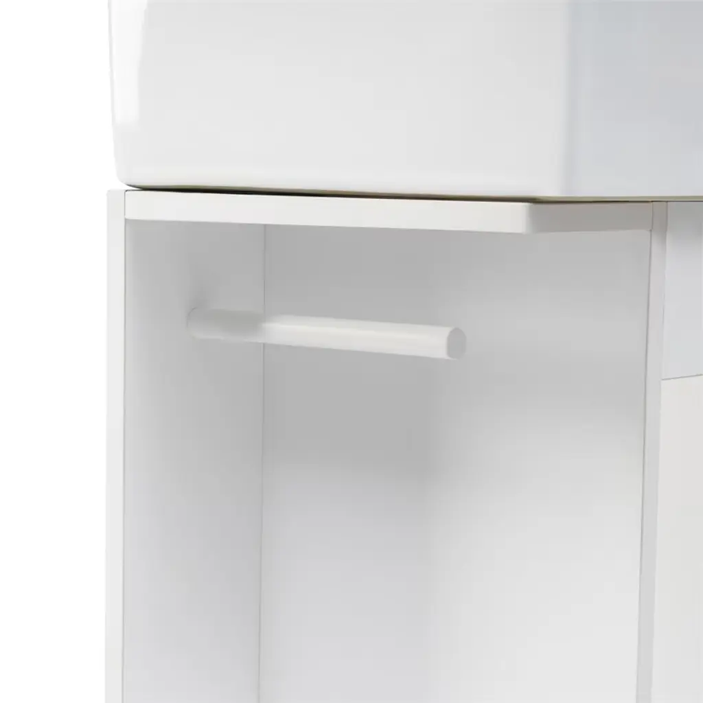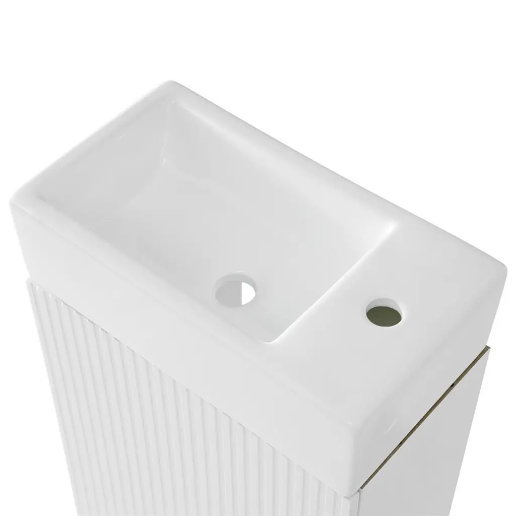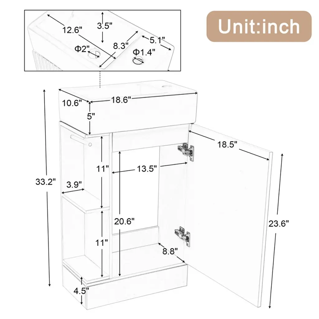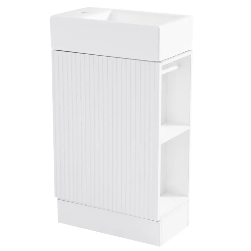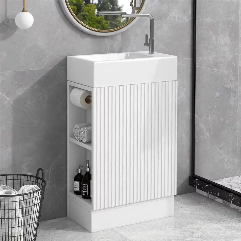 This stylish bathroom vanity combines functional storage with a durable ceramic sink, perfect for modern bathrooms. Crafted from waterproof MDF, it resists moisture, stains, and daily wear while maintaining a sleek appearance. The two-tier open shelf and toilet paper holder offer convenient storage for towels, toiletries, and essentials, keeping your space clutter-free.