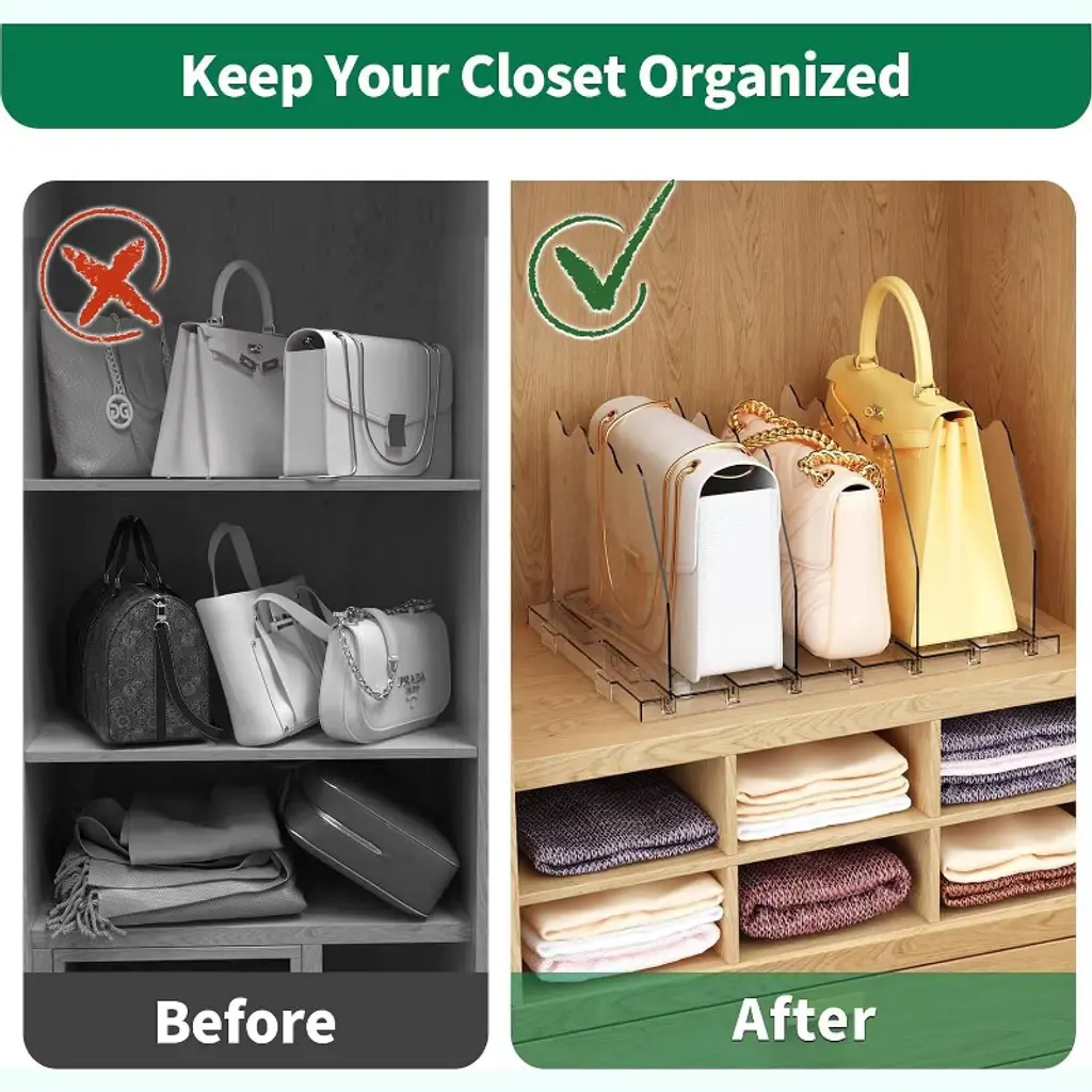 Transform Clutter into Order with Crystal Clear Precision! Tired of collapsing purses and tangled files? Our Premium Adjustable Shelf Dividers are your ultimate clutter-busting secret weapon! Engineered for luxury bag collectors and organization enthusiasts, this 8-piece set (2 complete bases + 8 dividers) brings military-grade precision to any space.