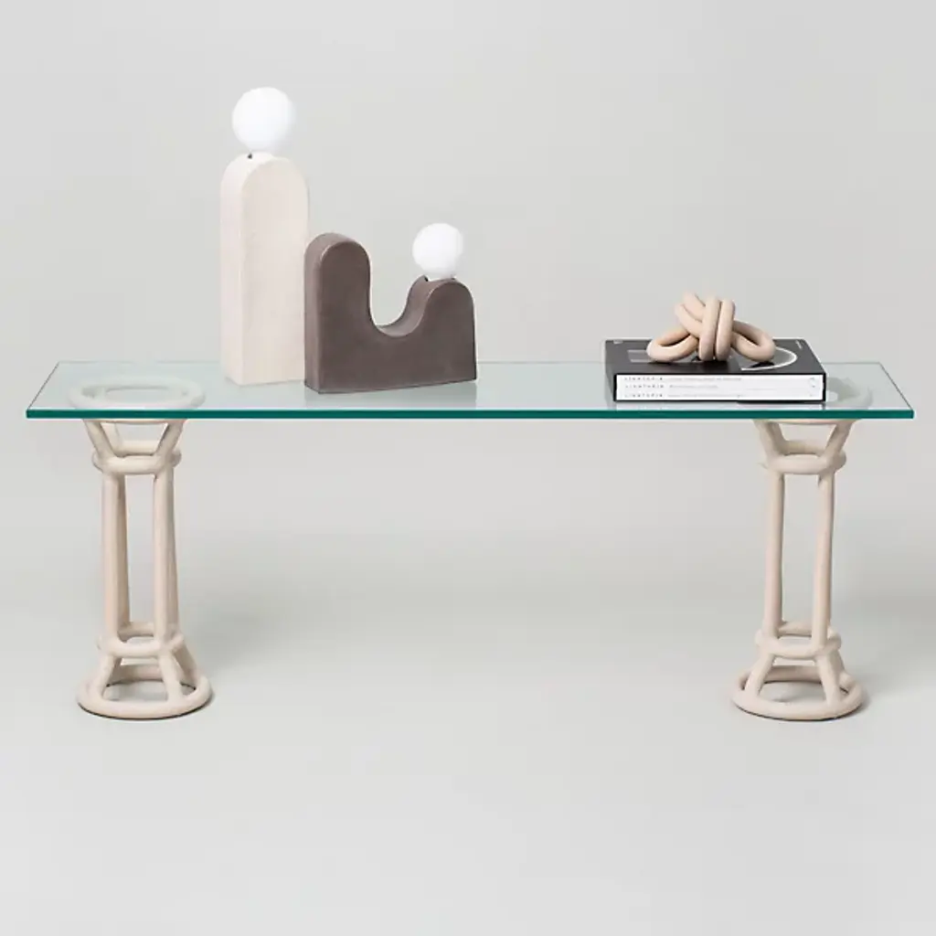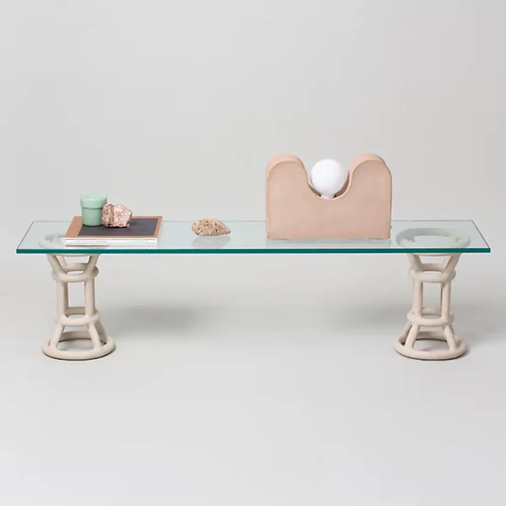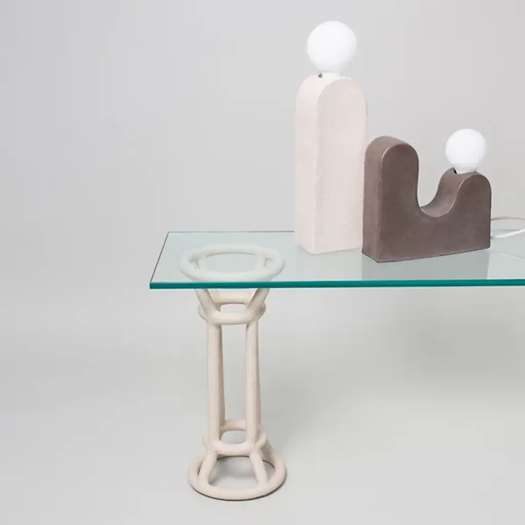 The Turret Shelf from SIN is a bold and balanced addition to the award-winning Fig shelving system. Inspired by classical columns and pedestals, reinterpreted through wireframe-style handcrafted ceramic bases with an open, tower-like design. Topped with a half-inch thick bronze tempered glass shelf, it balances the artisanal texture of the ceramic with the contemporary simplicity of the smooth glass shelf. The material contrasts draw the eye, blending airy aesthetics with a sturdy structure to add depth to any interior.