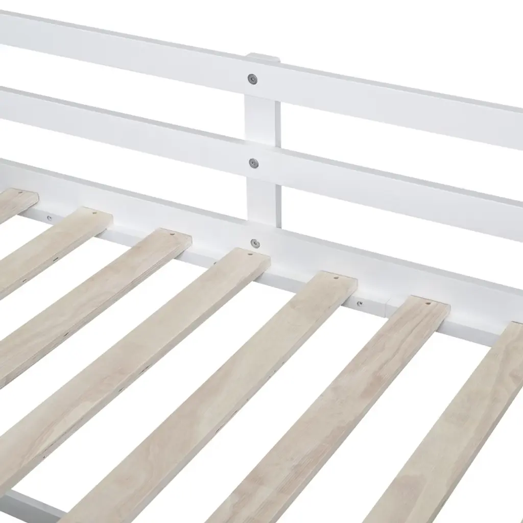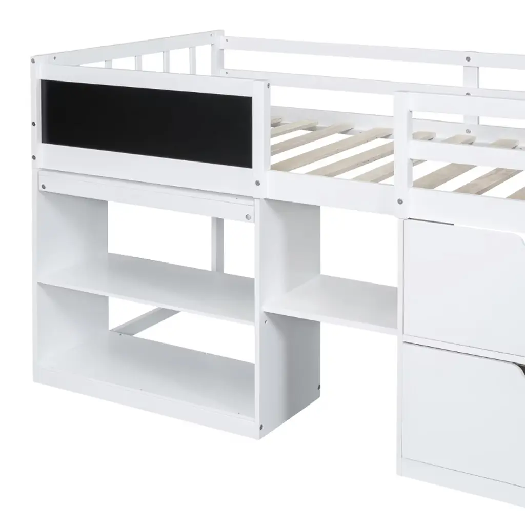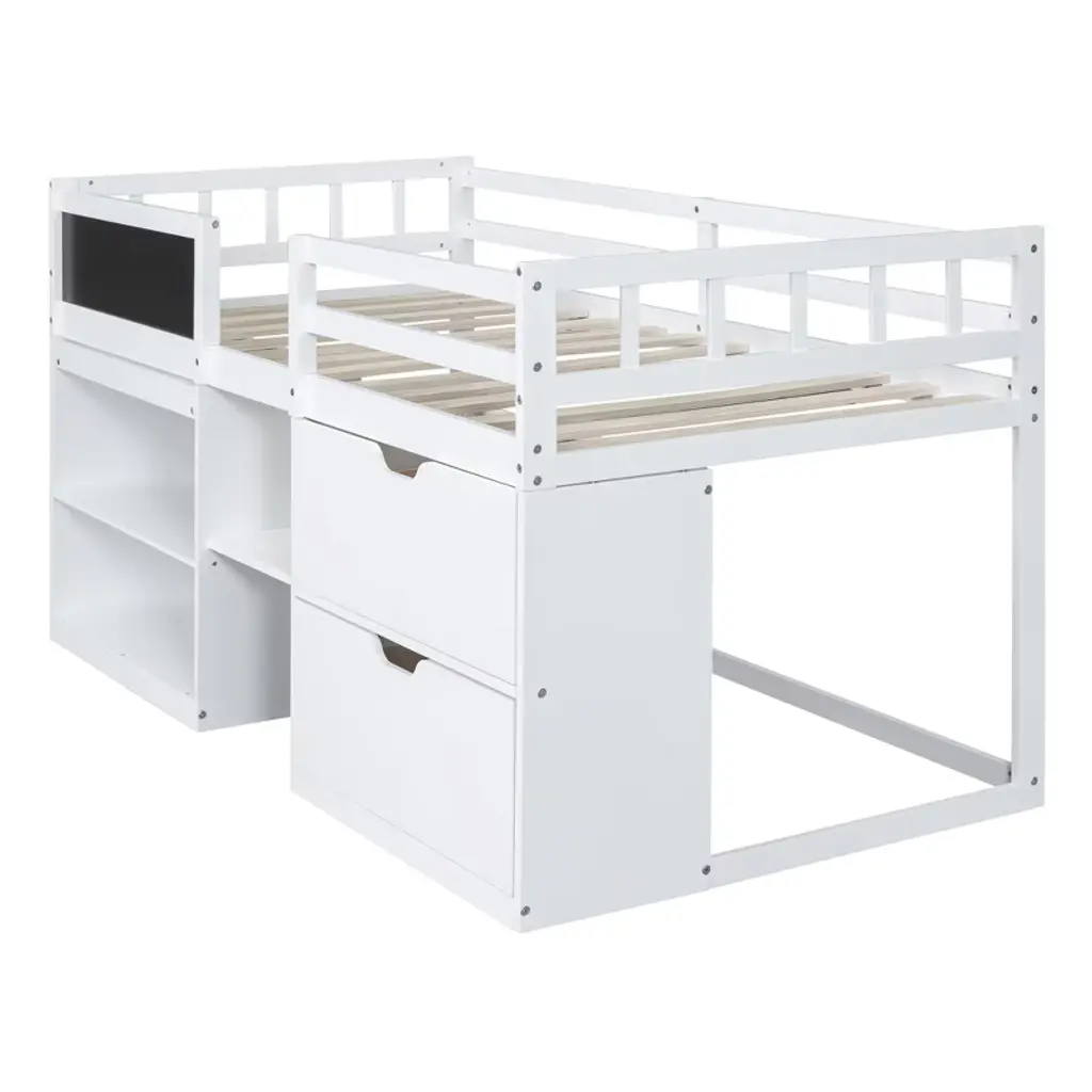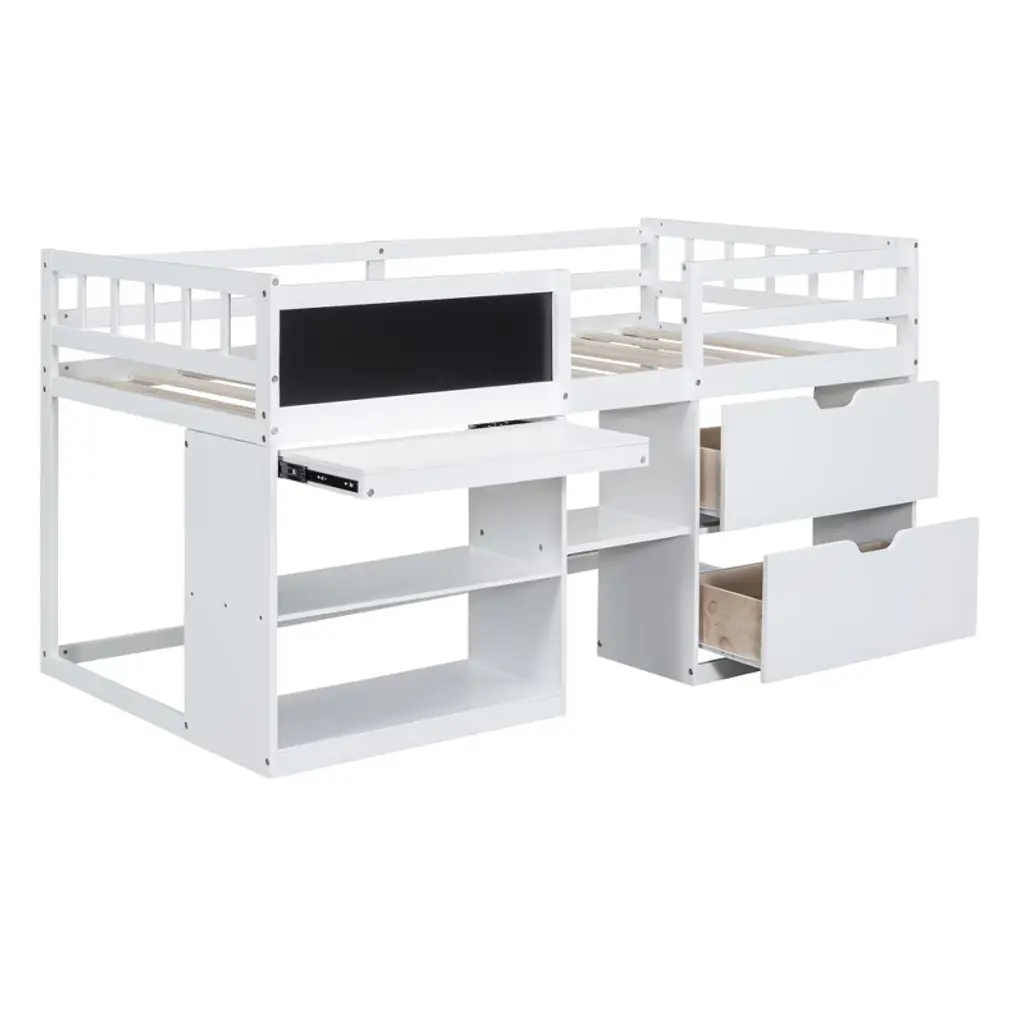 Product Features Maximized space – The low loft bed takes up minimal space in your bedroom. Functional and aesthetic, this bunk bed will enhance any room. Two underside storage drawers coupled with a two-tier bookshelf provide plenty of storage options to help keep your space tidy and organized. The built-in stair panel not only provides easy access to the bed, featuring full-length safety guardrails, but also acts as a shelf for small objects.Versatility galore – This bed features one loft bed, one rolling desk, one blackboard, and one bookshelf for accommodating your little one. When the desk is needed, simply roll it out from under the loft for more workspace. A blackboard alongside the bed is a great way to encourage creativity and let your child's imagination run wild.Solid Construction – The bed structure is crafted from high-quality solid pine wood, solid pine legs, and a strong, durable frame so that the bed remains sturdy and long-lasting.Stable and Safety – The loft bed features a full-length guardrail. Along with the handrail, this loft bed ensures top-notch security. What's more, the solid legs made of solid pine wood add strength and durability.Dimensions – 76.9'' x 42.4'' x 41.9'' (L x W x H). Mattress not included. Some assembly is required, although we have provided clear instructions and tools. Description Designed with a loft structure, enjoy the space underneath used to house storage drawers and a rolling desk. When the desk is needed, simply roll it out from under the loft for more workspace. A blackboard alongside the bed is a good touch to let your little one's imagination run wild. Two underside storage drawers coupled with a two-tier bookshelf provide plenty of storage options for you to help keep space tidy and organized. The built-in stair panel not only provides easy access to the bed featuring full-length safety guardrails, but also serves as a shelf for small objects. Weight & Dimensions Overall Product Dimension: 76.9"L x 42.4"W x 41.9"HNumbers of Package: 2Overall Product Weight: 135.38 LBSWeight Capacity: 250LBSNumber of Slats: 13Recommended Mattress Thickness: 6"Recommended age: > 6 years old Specifications Product Type: Loft BedSize: TwinMaterial: Plywood + MDF + PinewoodNotes: Manual measurement has been used, there may be some reasonable error. All the pictures are taken by actual samples, slight chromatic aberration may occur due to lighting or display.