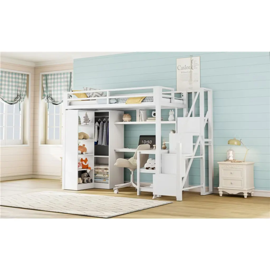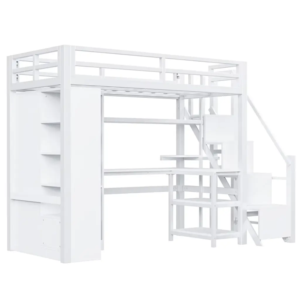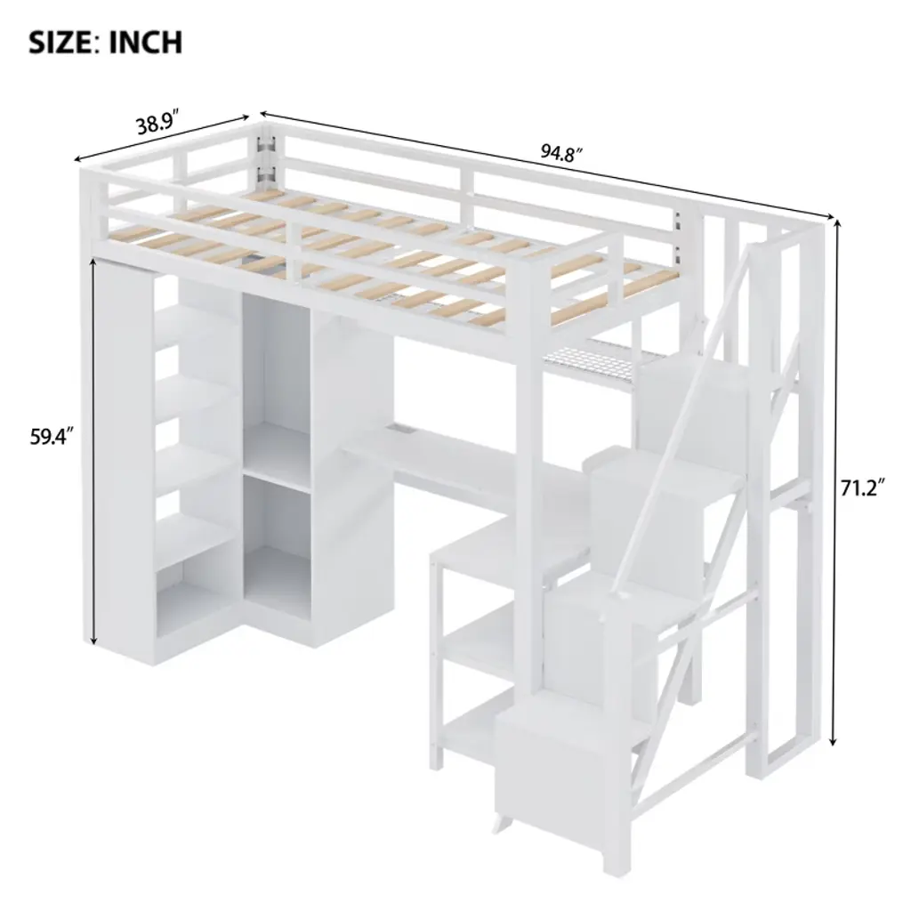 Product Features Contemporary Build: This twin-size metal loft bed embodies a modern classic aesthetic, featuring a streamlined metal frame that delivers sleekness and structure. The frame is enhanced by an eye-catching chrome finish (paired with a clean white base), adding a subtle touch of sophistication to its design. Its versatile style seamlessly complements various home decor themes—from minimalist and modern to casual and cozy—making it a stylish focal point for bedrooms, dorms, or guest rooms.Large Storage Space: This loft bed is designed with abundant storage to keep your space organized and clutter-free. Under the upper bed, there is a spacious built-in wardrobe equipped with a clothes rod, allowing you to fully hang shirts, dresses, jackets, and other garments that require wrinkle-free storage. A 5-layer shelf on the side of the bed offers additional storage for small items like lamps, books, toys, or daily essentials. The included table set (an L-shaped desk) provides a dedicated workspace, while extra shelves (both above and under the desk) offer room to store files, notebooks, or leisure items—maximizing every inch of available space.L-Shaped Desk with Multi-Layer Storage: The bed is fitted with a practical L-shaped desk, designed to optimize workspace while saving floor space. Above the desk, there is a sturdy metal storage shelf for placing items like desk lamps, books, or decorative pieces; under the desk, a 2-tier storage shelf provides hidden space for bins, files, or rarely used items. This multi-layer storage setup can accommodate most items needed for work, study, or leisure, keeping your workspace tidy and efficient.Easy Assembly & Complete Service: The bed frame package includes a detailed, step-by-step instruction manual, all necessary assembly tools, and clearly numbered parts—eliminating confusion during setup. Even with basic DIY skills, you can complete the assembly within 1 hour. Additionally, the bottom of the bed frame is equipped with plastic feet pads: these pads protect your floor (hardwood, carpet, tile, etc.) from scratches and scuffs, while also reducing friction if you need to reposition the bed.Built-In Charging Ports: This loft bed comes with a convenient charging station integrated into the desk, featuring 2 standard plug outlets, 1 USB port, and 1 Type-C port. This multi-port setup allows you to power laptops, smartphones, tablets, wireless earbuds, or desk lamps directly at your workspace—perfect for working on your laptop immediately or charging devices while lying in bed. No more searching for distant outlets or dealing with messy extension cords. Dimensions Overall Product Dimension: 94.8''L x 41.3''W x 71.2''H (a compact footprint that saves floor space, with enough height to accommodate the under-bed desk, wardrobe, and 5-layer shelf)Twin Bed: 74.8'' x 38.9'' (standard twin-size dimensions, ensuring a perfect fit for most twin-size mattresses)Total Height: 71.2'' (provides ample under-bed clearance for comfortable use of the desk and wardrobe, while keeping the upper bed easy to access via stepped stairs)Number of Bed Slats: 12pcs (evenly spaced metal slats that prevent mattress sagging and extend the mattress’s lifespan)Recommend Mattress Thickness of Bed: 6'' (optimal thickness—thick enough for comfort, without making the upper bed too high or blocking the under-bed space)Overall Product Weight: 355lbs (sturdy enough for long-term use and to support up to 400lbs, best assembled with 2 people for ease)