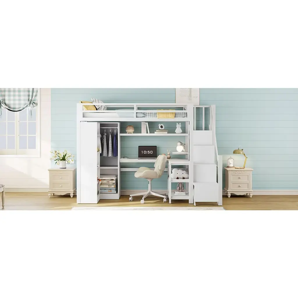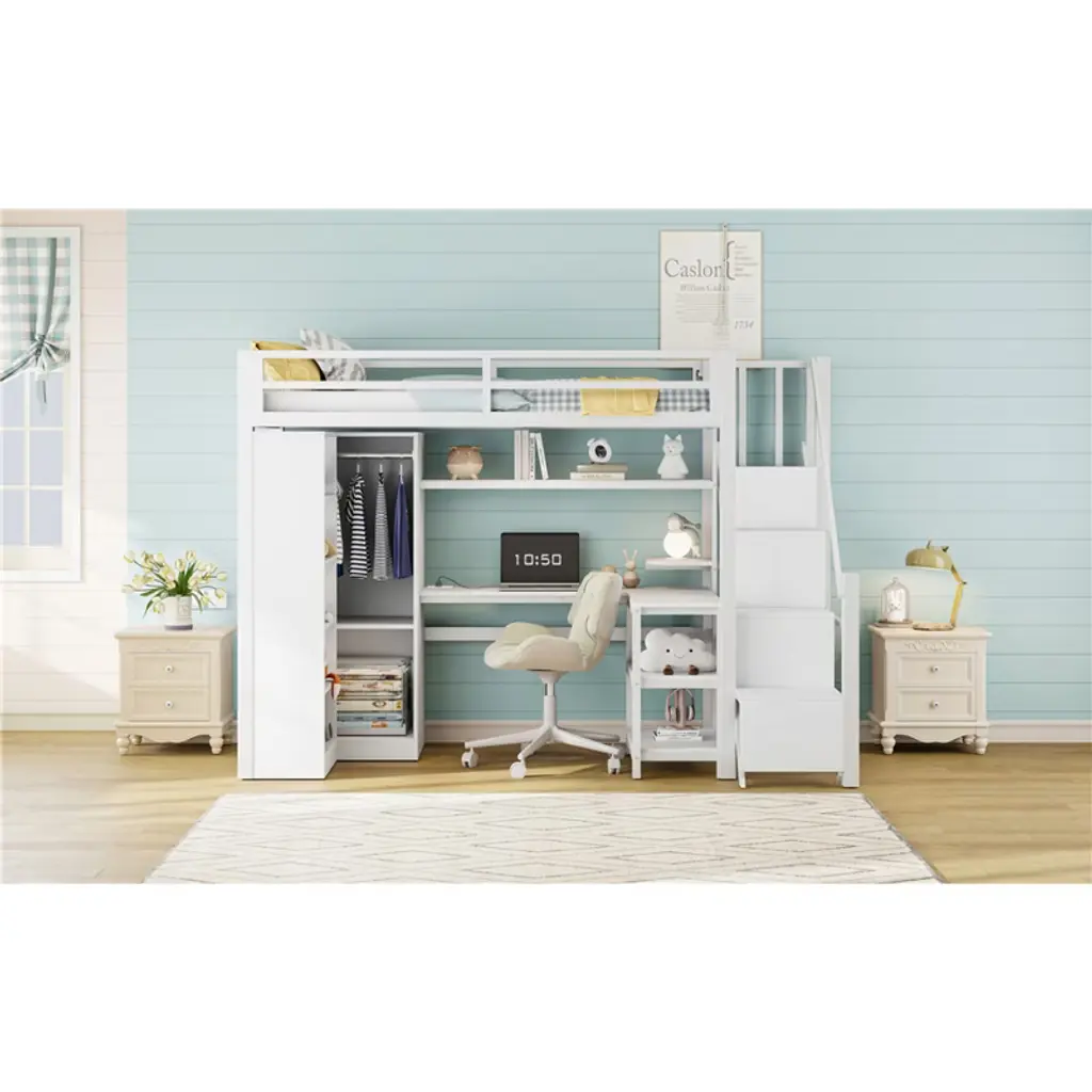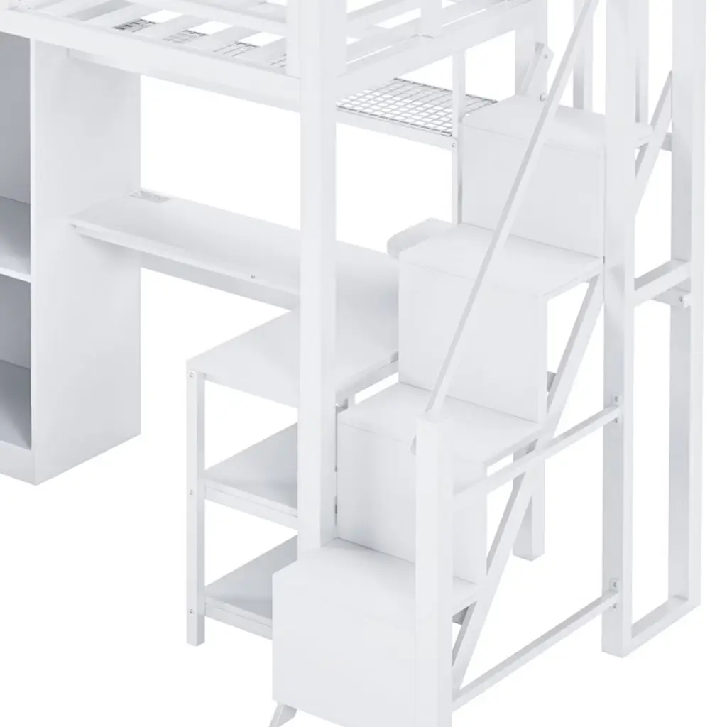 Product Features Contemporary Build: This twin-size metal loft bed embodies a modern classic aesthetic, featuring a streamlined metal frame that delivers sleekness and structure. The frame is enhanced by an eye-catching chrome finish (paired with a clean white base), adding a subtle touch of sophistication to its design. Its versatile style seamlessly complements various home decor themes—from minimalist and modern to casual and cozy—making it a stylish focal point for bedrooms, dorms, or guest rooms.Large Storage Space: This loft bed is designed with abundant storage to keep your space organized and clutter-free. Under the upper bed, there is a spacious built-in wardrobe equipped with a clothes rod, allowing you to fully hang shirts, dresses, jackets, and other garments that require wrinkle-free storage. A 5-layer shelf on the side of the bed offers additional storage for small items like lamps, books, toys, or daily essentials. The included table set (an L-shaped desk) provides a dedicated workspace, while extra shelves (both above and under the desk) offer room to store files, notebooks, or leisure items—maximizing every inch of available space.L-Shaped Desk with Multi-Layer Storage: The bed is fitted with a practical L-shaped desk, designed to optimize workspace while saving floor space. Above the desk, there is a sturdy metal storage shelf for placing items like desk lamps, books, or decorative pieces; under the desk, a 2-tier storage shelf provides hidden space for bins, files, or rarely used items. This multi-layer storage setup can accommodate most items needed for work, study, or leisure, keeping your workspace tidy and efficient.Easy Assembly & Complete Service: The bed frame package includes a detailed, step-by-step instruction manual, all necessary assembly tools, and clearly numbered parts—eliminating confusion during setup. Even with basic DIY skills, you can complete the assembly within 1 hour. Additionally, the bottom of the bed frame is equipped with plastic feet pads: these pads protect your floor (hardwood, carpet, tile, etc.) from scratches and scuffs, while also reducing friction if you need to reposition the bed.Built-In Charging Ports: This loft bed comes with a convenient charging station integrated into the desk, featuring 2 standard plug outlets, 1 USB port, and 1 Type-C port. This multi-port setup allows you to power laptops, smartphones, tablets, wireless earbuds, or desk lamps directly at your workspace—perfect for working on your laptop immediately or charging devices while lying in bed. No more searching for distant outlets or dealing with messy extension cords. Dimensions Overall Product Dimension: 94.8''L x 41.3''W x 71.2''H (a compact footprint that saves floor space, with enough height to accommodate the under-bed desk, wardrobe, and 5-layer shelf)Twin Bed: 74.8'' x 38.9'' (standard twin-size dimensions, ensuring a perfect fit for most twin-size mattresses)Total Height: 71.2'' (provides ample under-bed clearance for comfortable use of the desk and wardrobe, while keeping the upper bed easy to access via stepped stairs)Number of Bed Slats: 12pcs (evenly spaced metal slats that prevent mattress sagging and extend the mattress’s lifespan)Recommend Mattress Thickness of Bed: 6'' (optimal thickness—thick enough for comfort, without making the upper bed too high or blocking the under-bed space)Overall Product Weight: 355lbs (sturdy enough for long-term use and to support up to 400lbs, best assembled with 2 people for ease)