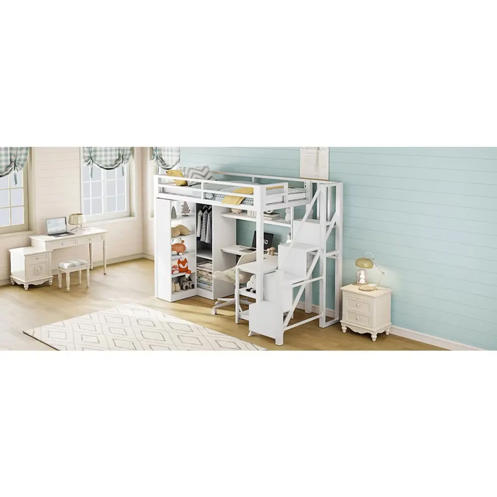 Twin Size Metal Loft Bed With Stepped Stairs, Desk And 5-layer Shelf