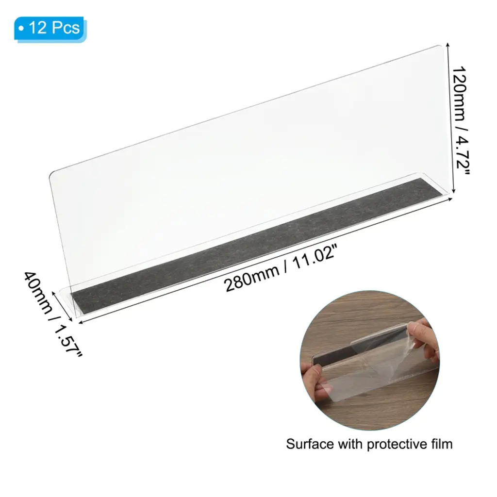 Made of acrylic, it boasts high transparency, resists yellowing, and has a long shelf life. The L-shaped partition design resists tipping or tilting, ensuring neat and aesthetically pleasing storage. The transparent partition can also be used along the edge of a table to fill the gap between the table and the wall, preventing items from falling. It can be used to store and organize a wide range of items, including beverages, bread, cookies, clothing, and spice bottles. It's suitable for shops, supermarkets, libraries, clubs, and more. Instructions: Easily organize cluttered shelves by snapping items vertically into place with tool-free installation.