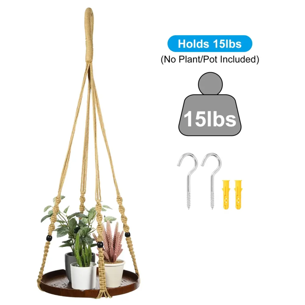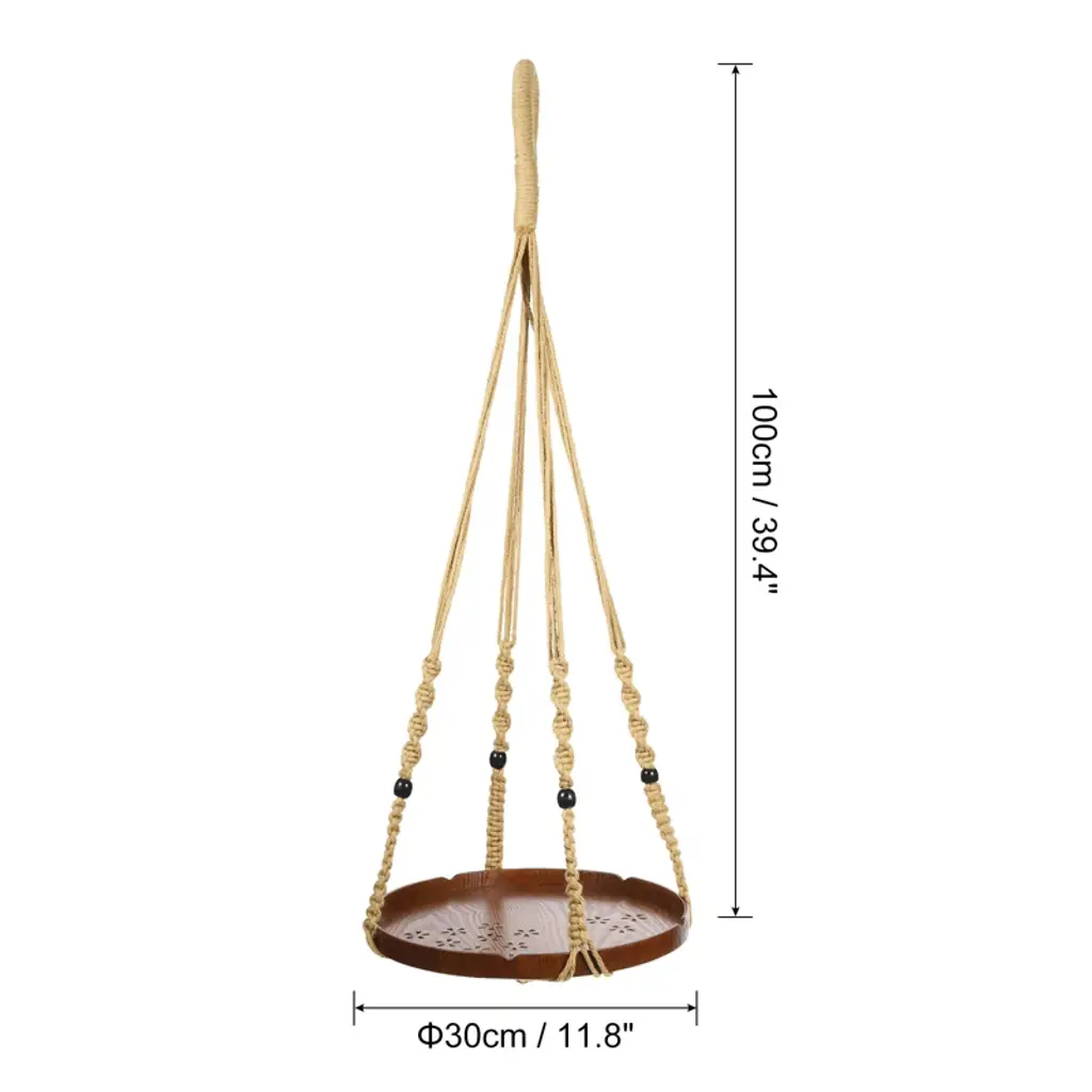 Enhance your home decor with this Macrame Hanging Plant Shelf featuring a sturdy wood base. Designed for both indoor and outdoor use, this hanging planter provides a stylish solution for maximizing space in small apartments or homes. Its vertical gardening capability allows you to add greenery without sacrificing floor space. The wooden board supports your favorite plants, adding a modern touch to any setting. Note that the package includes one hanging plant shelf, and flower pots are not included. Measurements may have a slight error of 1-2cm.