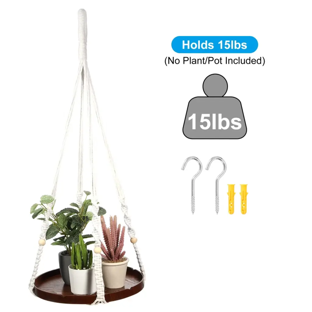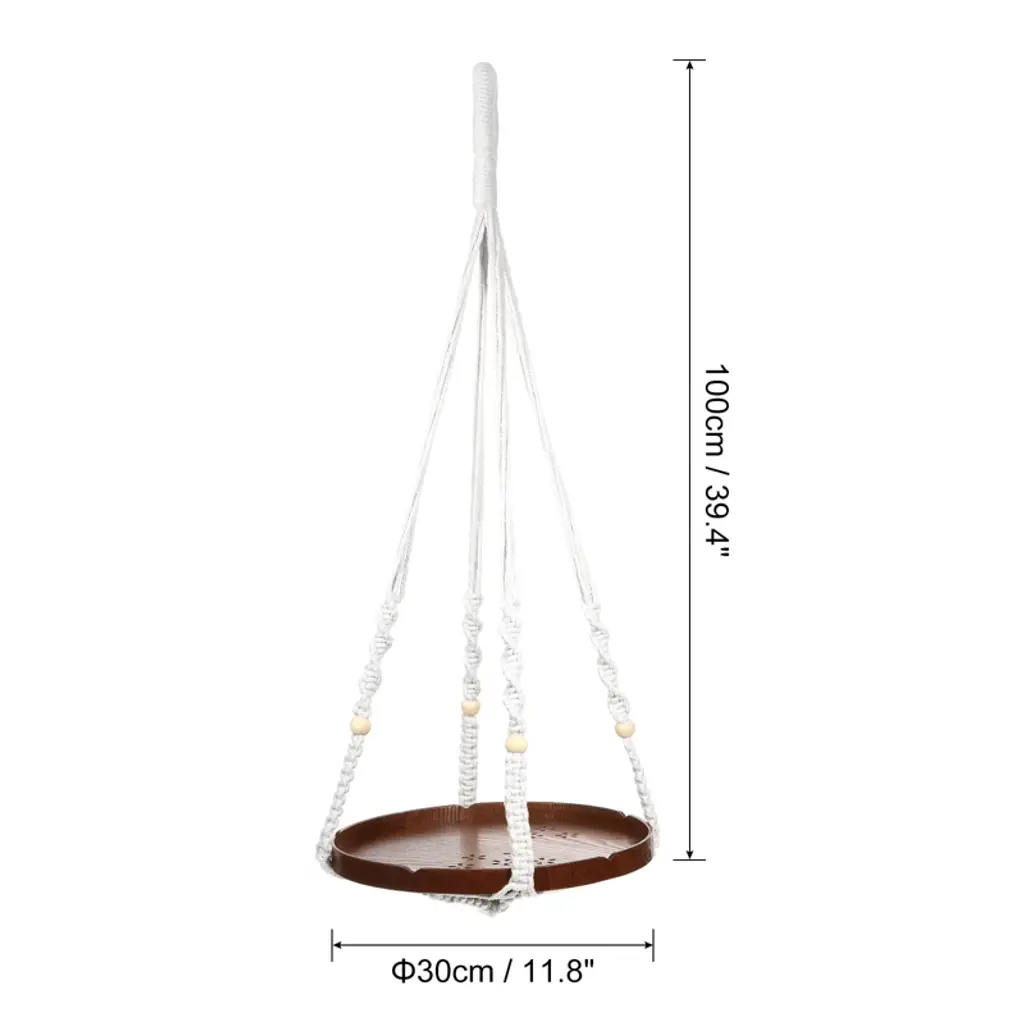 Enhance your home decor with this Macrame Hanging Plant Shelf featuring a sturdy wood base. Designed for both indoor and outdoor use, this hanging planter provides a stylish solution for maximizing space in small apartments or homes. Its vertical gardening capability allows you to add greenery without sacrificing floor space. The wooden board supports your favorite plants, adding a modern touch to any setting. Note that the package includes one hanging plant shelf, and flower pots are not included. Measurements may have a slight error of 1-2cm.