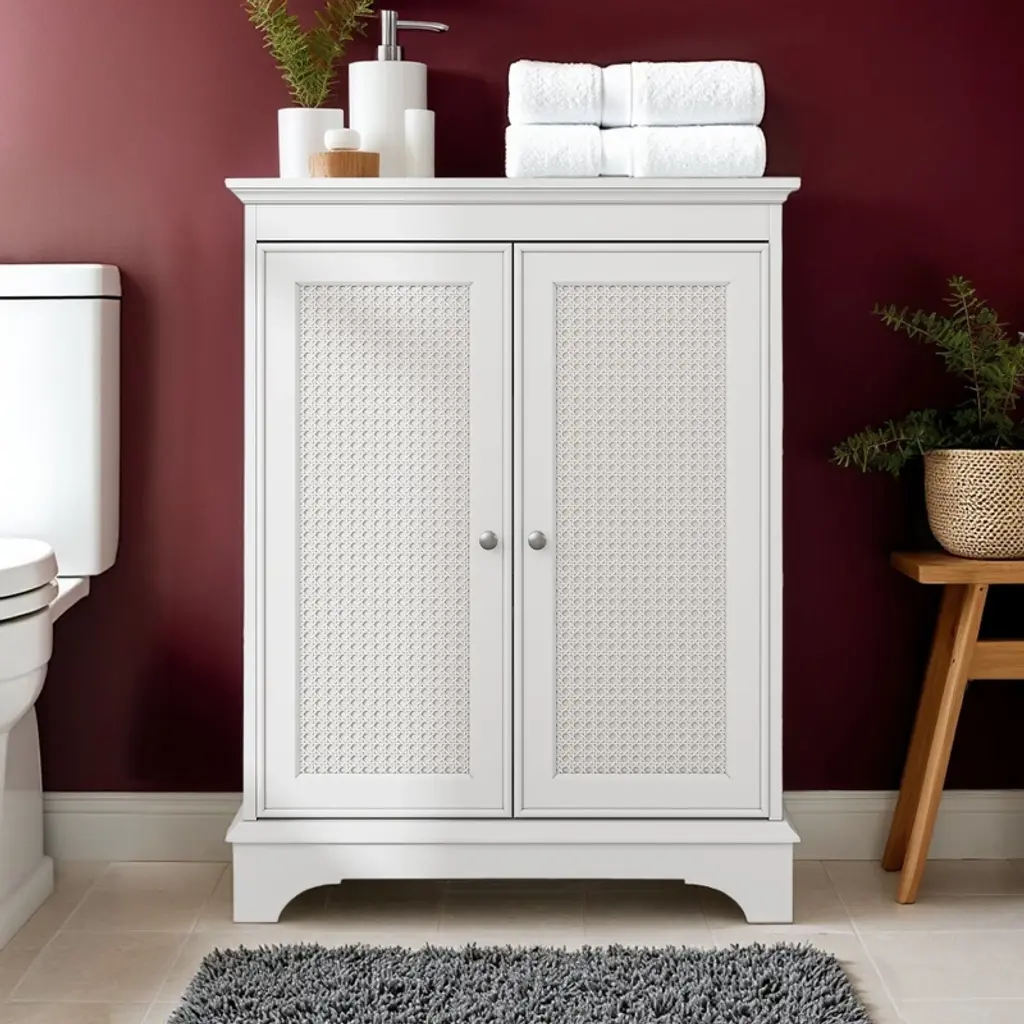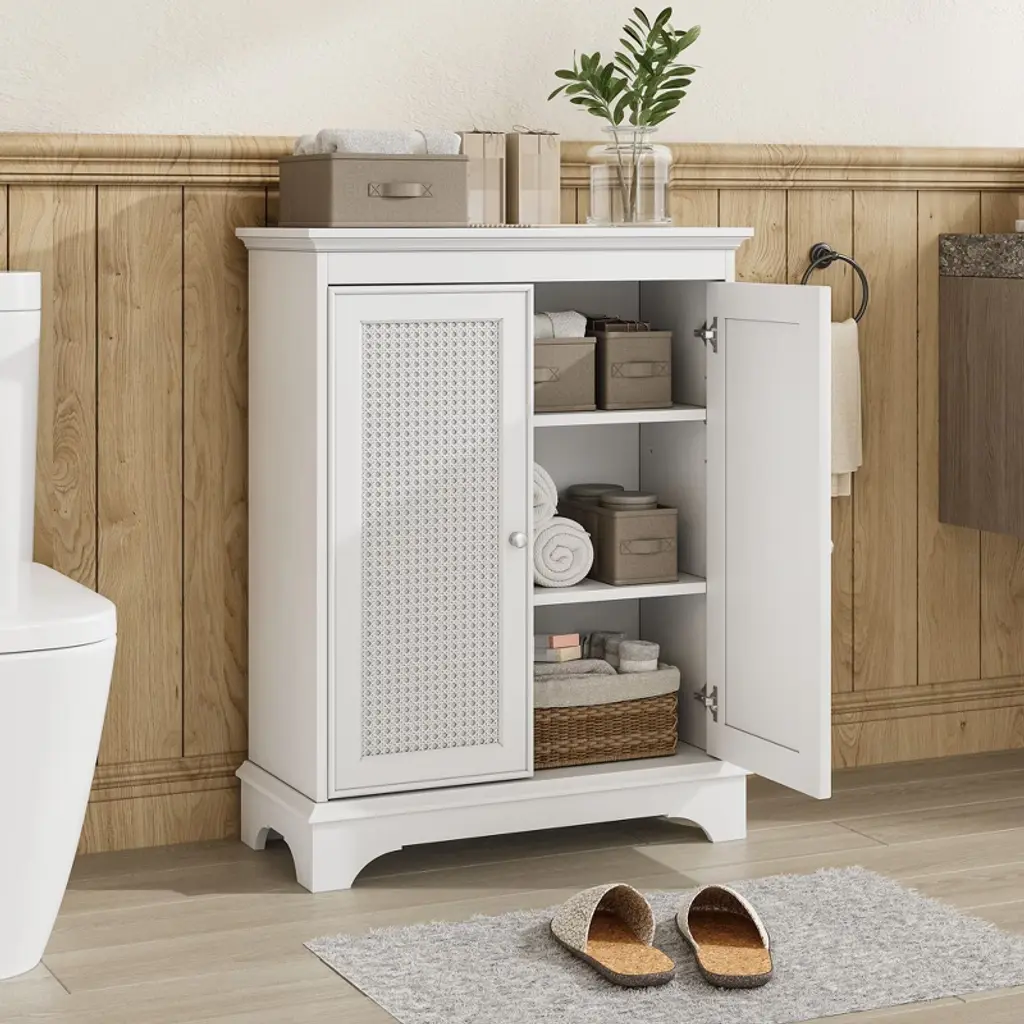 Open this white cabinet to reveal adjustable partitions that fit your needs. Store kitchenware, toiletries, or linens behind woven rattan doors. Secure it with anti-tip hardware for safety. Use the spacious top to display plants or gadgets. Built from durable MDF, it resists scratches and moisture. Assemble easily and add a natural, practical accent to any room.