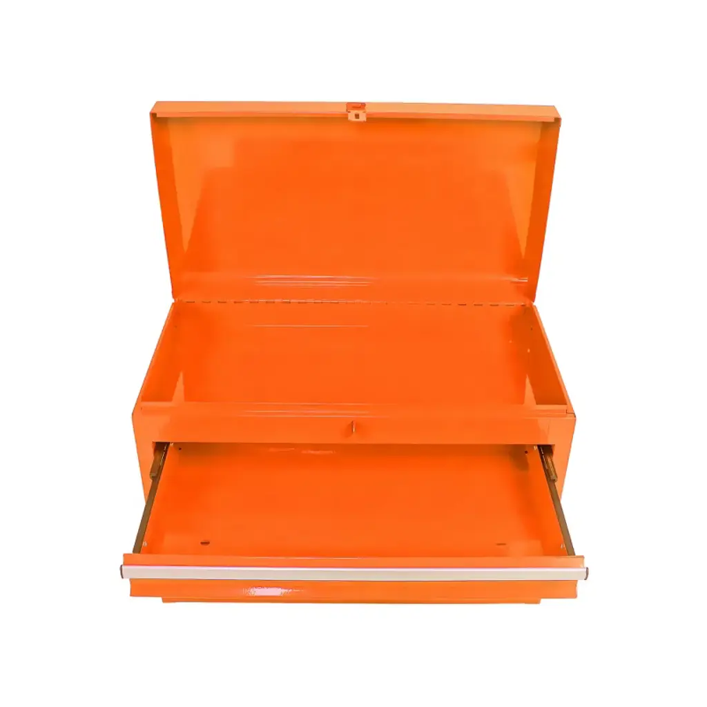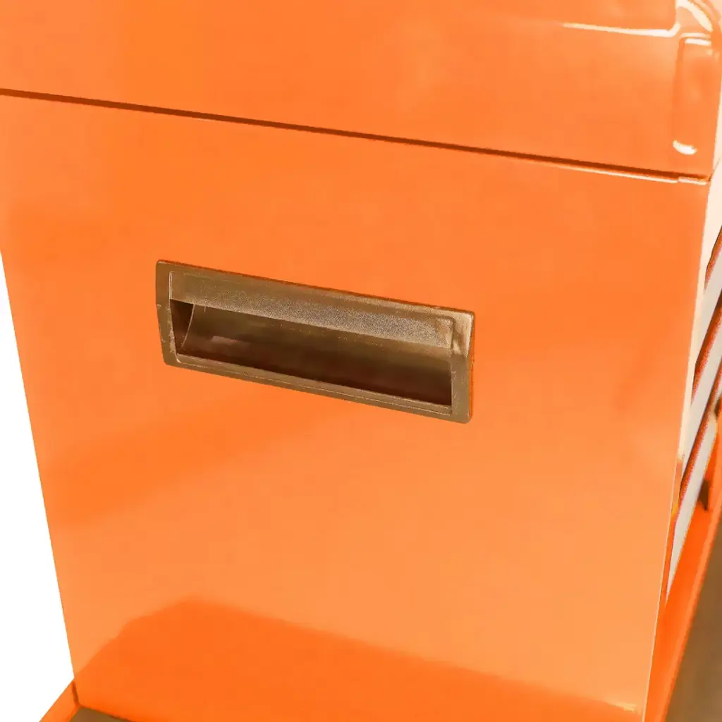 Keep your tools secure and organized with this heavy-duty rolling tool chest, designed for maximum storage and mobility. Featuring five smooth-gliding ball-bearing drawers (15kg capacity each) and a 100kg total load capacity, this metal cabinet provides ample space for wrenches, drills, and other essentials. The four lockable wheels allow easy movement around your garage or workshop, while the adjustable interior shelf and hanging panel offer customizable organization. Additional features include six tool-setting holes, a detachable top for flexible use, and durable plastic handles for comfortable transport. Built from sturdy metal with a sleek orange finish, this versatile storage solution combines security, convenience, and rugged durability perfect for professionals and DIYers alike. Keep your workspace tidy and tools within reach with this all-in-one tool cabinet.