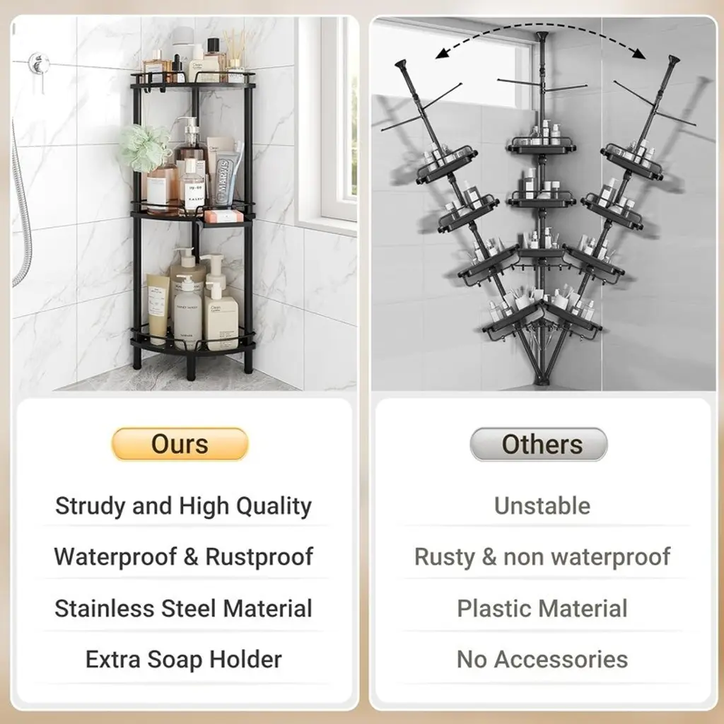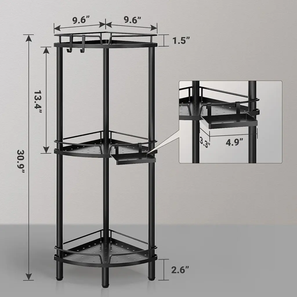 DURABLE AND RUST-PROOF: Bathroom shower organizer is made of high quality stainless steel, each shower shelf is durable, rust-proof and waterproof, with high temperature baking paint process, it can withstand the humid bathroom environment, durable and long-lasting.MULTIFUNCTIONAL SHOWER ORGANIZER: Our floor standing shower caddy comes with two hooks and a soap holder for more convenient use. The removable hooks can be used to hang razors, bath sponges, brushes, towels and more.SAFETY SIDE RAILS AND ADJUSTABLE FEET: The side rails protect bottles and prevent items from slipping off the shower shelf and falling into the tub or onto the floor. Meanwhile, the rubber adjustable feet ensure stability even on uneven floors without causing damage or rustingEFFICIENT DRAINAGE: The drain holes in the shower shelf have a hollow design that not only prevents water from pooling, but also promotes fast and efficient drainage. This feature not only helps to keep the shelf dry, but also ensures that the storage space is neat and organized.Space-saving, widely spaced tiers: The Corner Shower Shelf is ideal for placing in the corner of bathtubs and shower areas. With a height of 13.4 inches between each shelf, it holds plenty of shampoo, body wash and other toiletries. Please check dimensions for compatibility with smaller tubs.QUICK AND EASY ASSEMBLY: Get rid of the hassle of traditional mounted shower shelves! Our free mounting bracket for you
