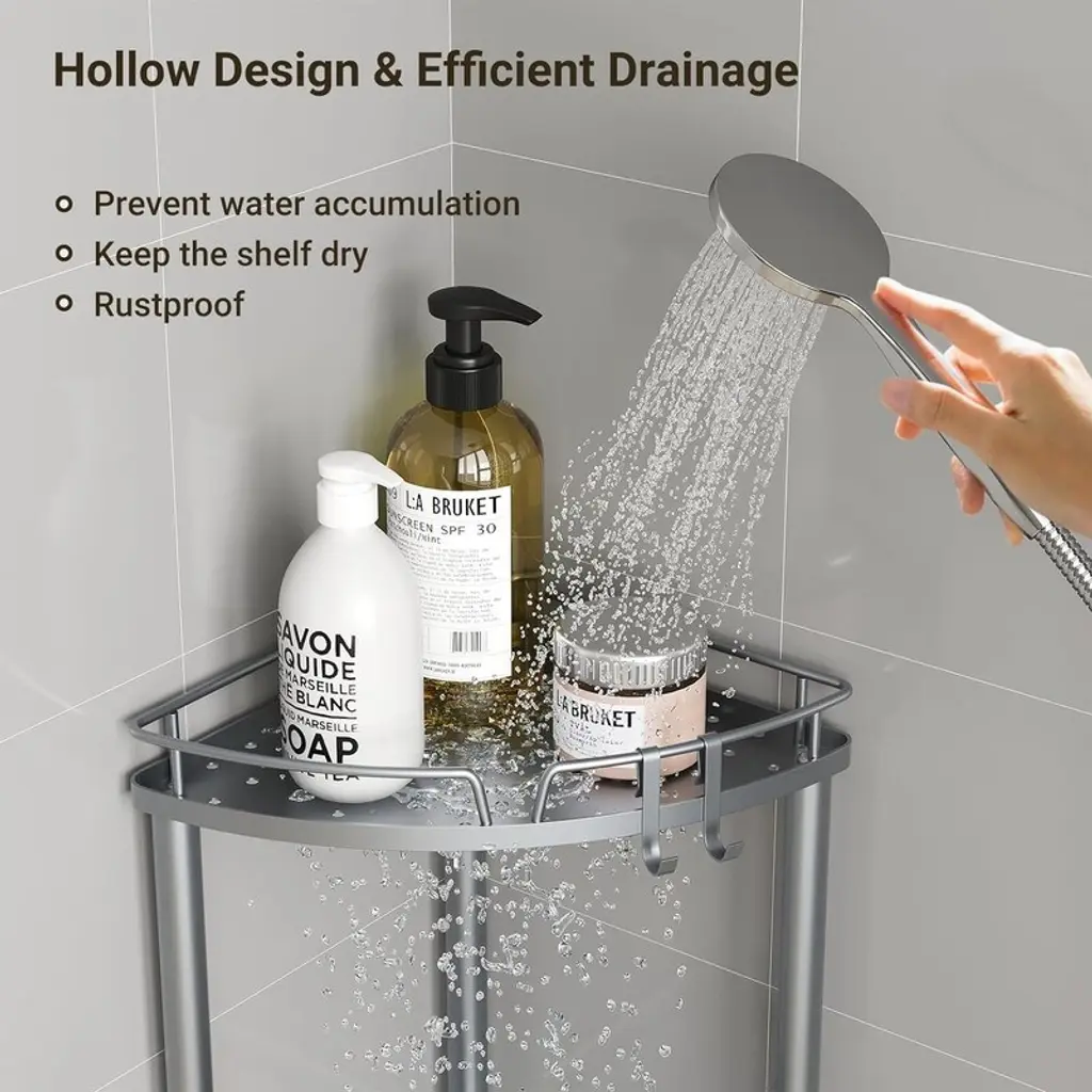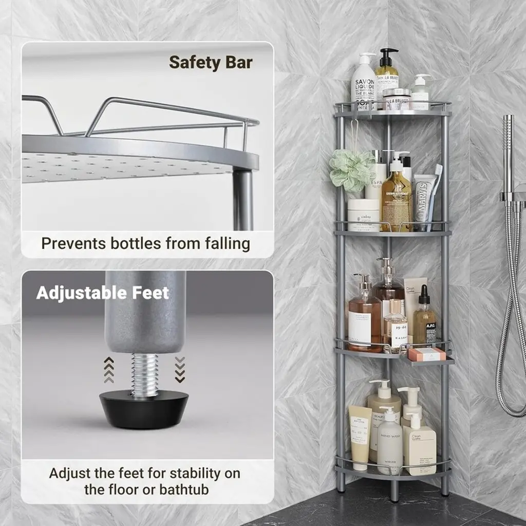 DURABLE AND RUST-PROOF: Bathroom shower organizer is made of high quality stainless steel, each shower shelf is durable, rust-proof and waterproof, with high temperature baking paint process, it can withstand the humid bathroom environment, durable and long-lasting.MULTIFUNCTIONAL SHOWER ORGANIZER: Our floor standing shower caddy comes with two hooks and a soap holder for more convenient use. The removable hooks can be used to hang razors, bath sponges, brushes, towels and more.SAFETY SIDE RAILS AND ADJUSTABLE FEET: The side rails protect bottles and prevent items from slipping off the shower shelf and falling into the tub or onto the floor. Meanwhile, the rubber adjustable feet ensure stability even on uneven floors without causing damage or rustingEFFICIENT DRAINAGE: The drain holes in the shower shelf have a hollow design that not only prevents water from pooling, but also promotes fast and efficient drainage. This feature not only helps to keep the shelf dry, but also ensures that the storage space is neat and organized.Space-saving, widely spaced tiers: The Corner Shower Shelf is ideal for placing in the corner of bathtubs and shower areas. With a height of 13.4 inches between each shelf, it holds plenty of shampoo, body wash and other toiletries. Please check dimensions for compatibility with smaller tubs.QUICK AND EASY ASSEMBLY: Get rid of the hassle of traditional mounted shower shelves! Our free mounting bracket for you