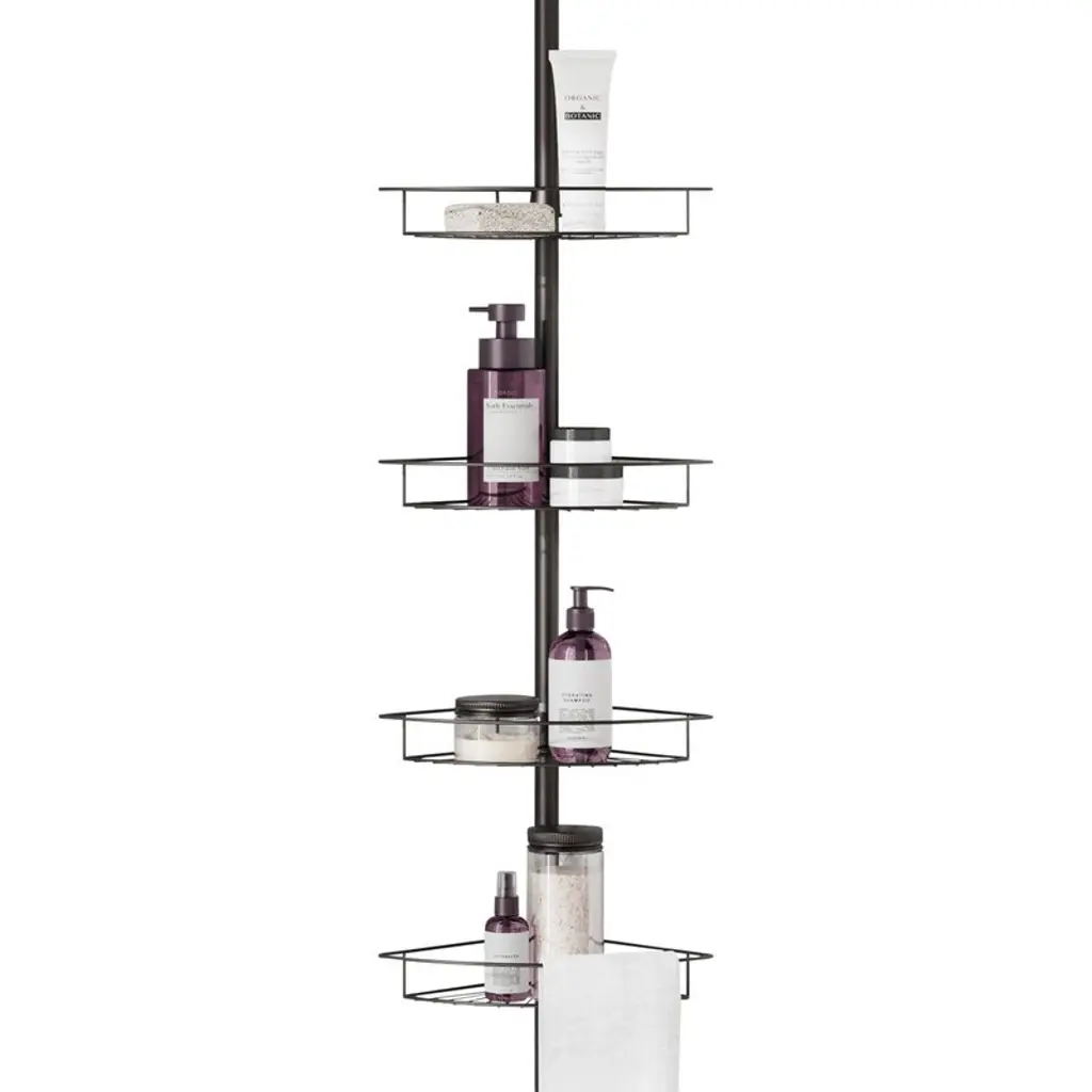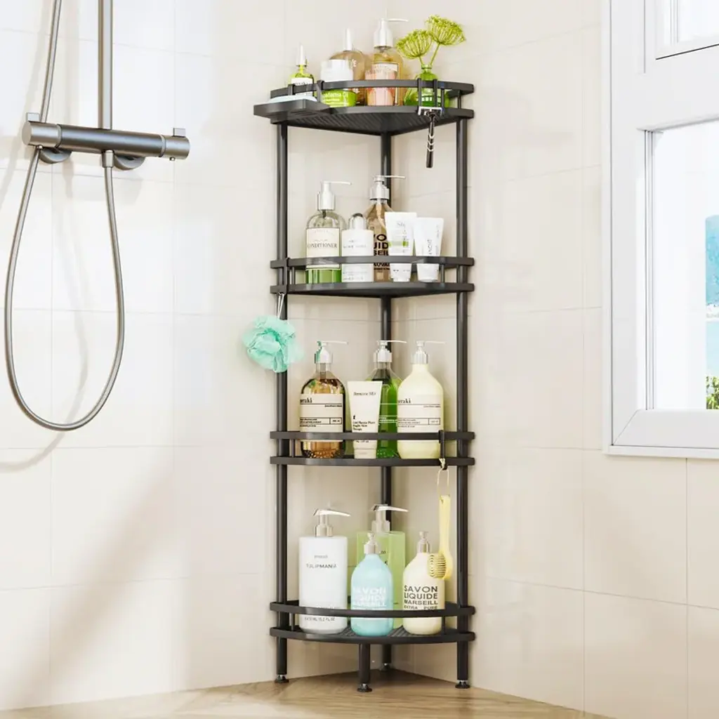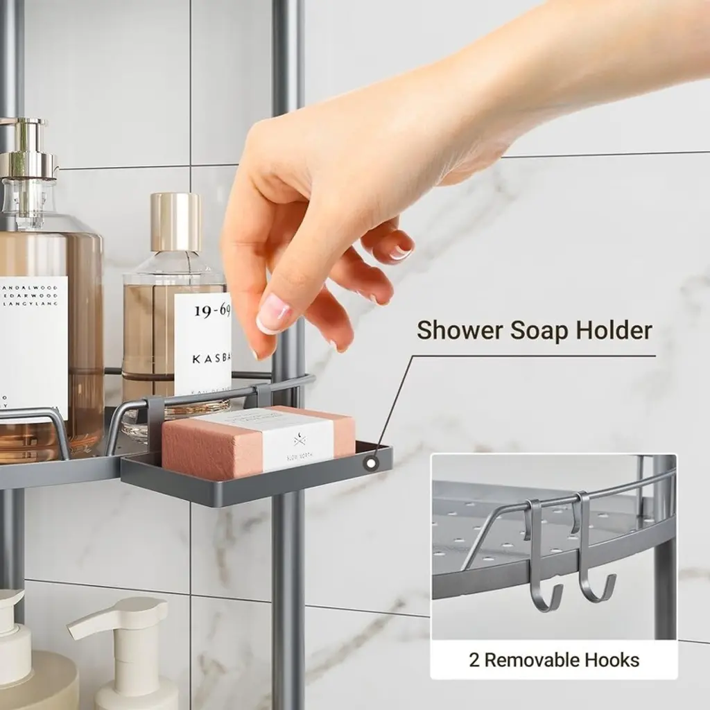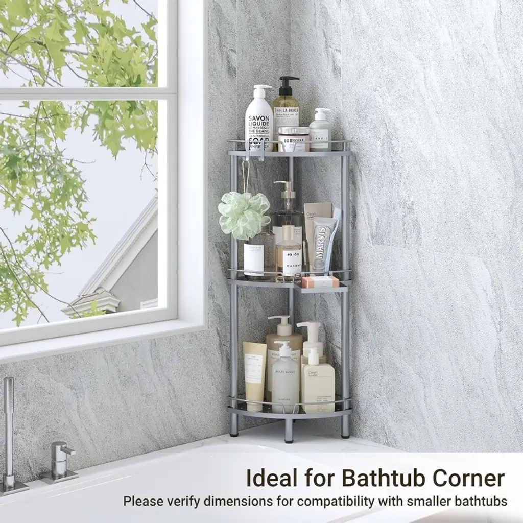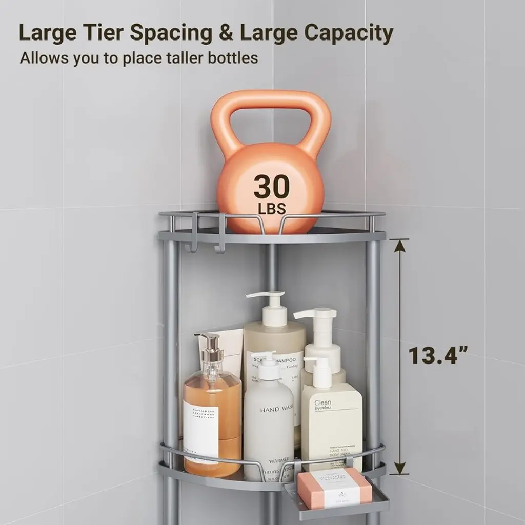DURABLE AND RUST-PROOF: Bathroom shower organizer is made of high quality stainless steel, each shower shelf is durable, rust-proof and waterproof, with high temperature baking paint process, it can withstand the humid bathroom environment, durable and long-lasting.MULTIFUNCTIONAL SHOWER ORGANIZER: Our floor standing shower caddy comes with two hooks and a soap holder for more convenient use. The removable hooks can be used to hang razors, bath sponges, brushes, towels and more.SAFETY SIDE RAILS AND ADJUSTABLE FEET: The side rails protect bottles and prevent items from slipping off the shower shelf and falling into the tub or onto the floor. Meanwhile, the rubber adjustable feet ensure stability even on uneven floors without causing damage or rustingEFFICIENT DRAINAGE: The drain holes in the shower shelf have a hollow design that not only prevents water from pooling, but also promotes fast and efficient drainage. This feature not only helps to keep the shelf dry, but also ensures that the storage space is neat and organized.Space-saving, widely spaced tiers: The Corner Shower Shelf is ideal for placing in the corner of bathtubs and shower areas. With a height of 13.4 inches between each shelf, it holds plenty of shampoo, body wash and other toiletries. Please check dimensions for compatibility with smaller tubs.QUICK AND EASY ASSEMBLY: Get rid of the hassle of traditional mounted shower shelves! Our free mounting bracket for you