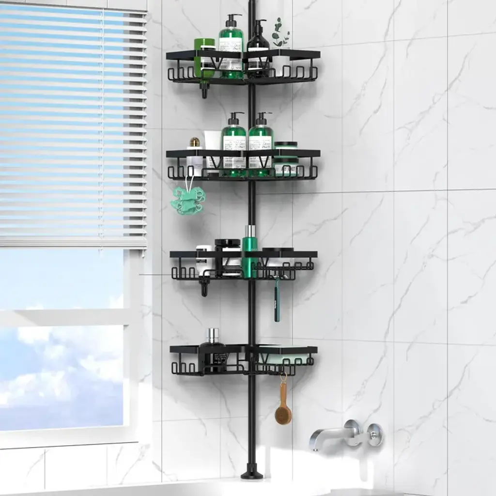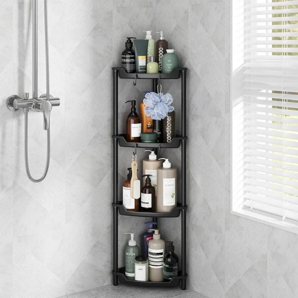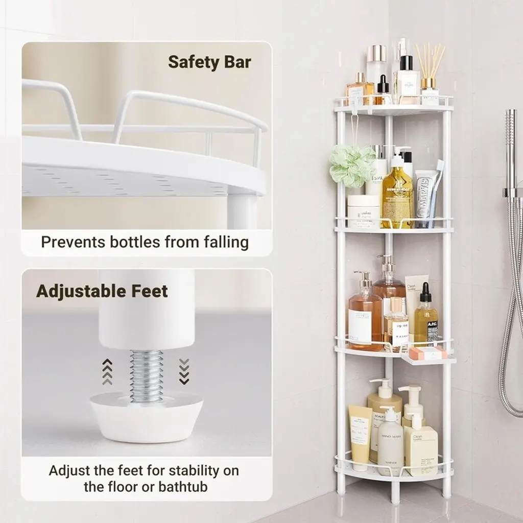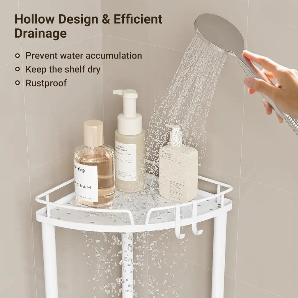 DURABLE AND RUST-PROOF: Bathroom shower organizer is made of high quality stainless steel, each shower shelf is durable, rust-proof and waterproof, with high temperature baking paint process, it can withstand the humid bathroom environment, durable and long-lasting.MULTIFUNCTIONAL SHOWER ORGANIZER: Our floor standing shower caddy comes with two hooks and a soap holder for more convenient use. The removable hooks can be used to hang razors, bath sponges, brushes, towels and more.SAFETY SIDE RAILS AND ADJUSTABLE FEET: The side rails protect bottles and prevent items from slipping off the shower shelf and falling into the tub or onto the floor. Meanwhile, the rubber adjustable feet ensure stability even on uneven floors without causing damage or rustingEFFICIENT DRAINAGE: The drain holes in the shower shelf have a hollow design that not only prevents water from pooling, but also promotes fast and efficient drainage. This feature not only helps to keep the shelf dry, but also ensures that the storage space is neat and organized.Space-saving, widely spaced tiers: The Corner Shower Shelf is ideal for placing in the corner of bathtubs and shower areas. With a height of 13.4 inches between each shelf, it holds plenty of shampoo, body wash and other toiletries. Please check dimensions for compatibility with smaller tubs.QUICK AND EASY ASSEMBLY: Get rid of the hassle of traditional mounted shower shelves! Our free mounting bracket for you