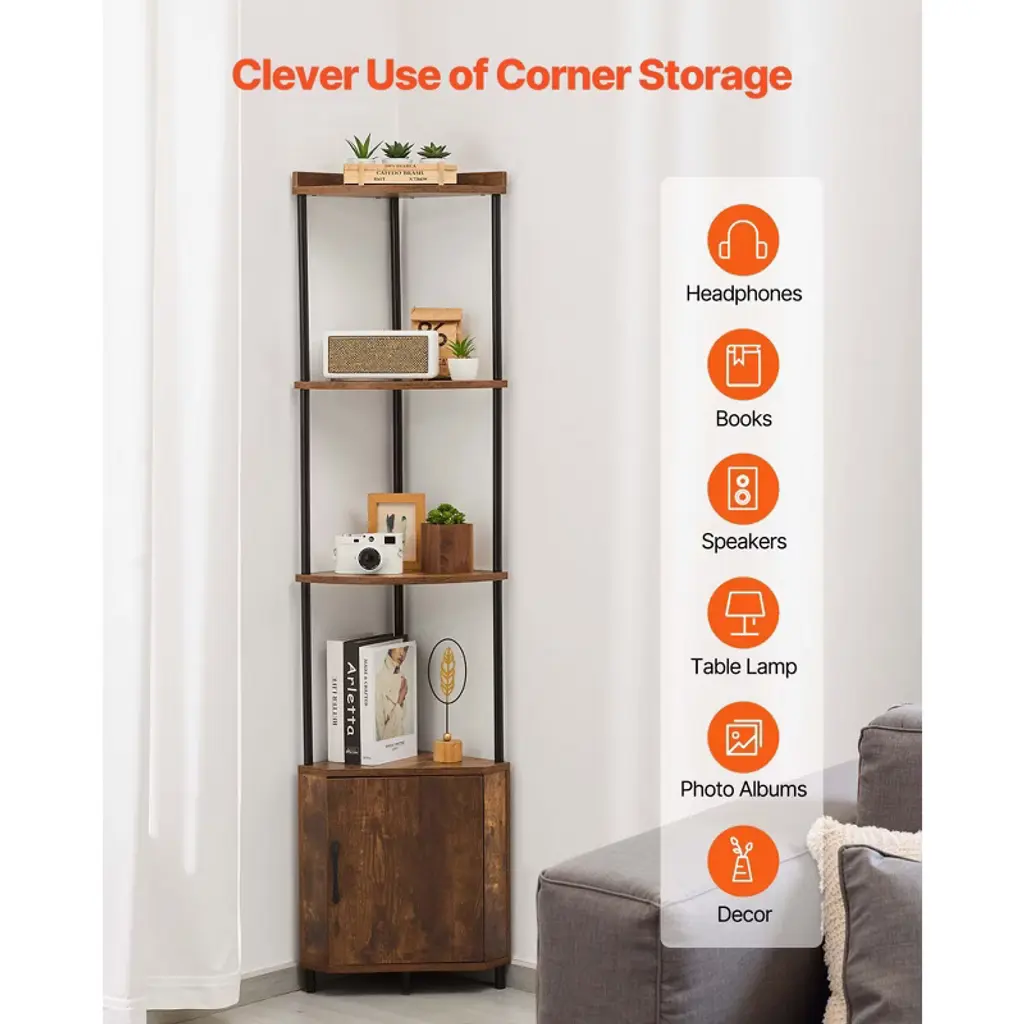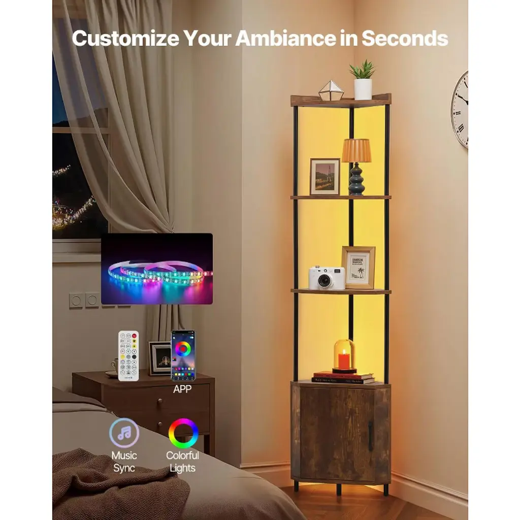 Feature: Corner Shelf with Lights: This multifunctional corner shelf combines strip lighting with multi-tiered storage space. You can make full use of your corners to gain more storage and add a good touch to those often-overlooked corners. It's ideal for placing in the living room, bedroom, home office, or kitchen Smart Light Control: you can customize various lighting colors, brightness, color temperatures, and dynamic/static modes Large Capacity & Categorized Storage: The triangular pillar design, with a 90° angle, fits into any corner. The open and closed cabinet spaces provide storage for various items. You can categorize and place headphones, books, artwork, small plants, and more. The adjustable internal dividers make it easy to store items of various sizes, and the cabinet doors can be closed to ensure privacy and keep dust out Stable Structure: Made from durable MDF boards and sturdy metal, each shelf can hold up to 60 lbs / 27 kg, ensuring long-lasting stability and durability without easily warping. The adjustable feet help the shelf stay stable on uneven floors. The two anti-tip devices included are compatible with various wall types, such as tile, wood, or cement walls. Please make sure to install the anti-tip devices before use Easy Assembly & Maintenance: This shelf comes with all necessary accessories and assembly instructions, making the setup process simple. The shelf is moisture-resistant and easy to clean, requiring only a damp cloth for regular maintenance. Note: Due to lighting conditions and differences in viewing devices, there may be slight color variations between the actual product and the photos Package Content 1 x Corner Shelf Set 1 x Instruction Manual