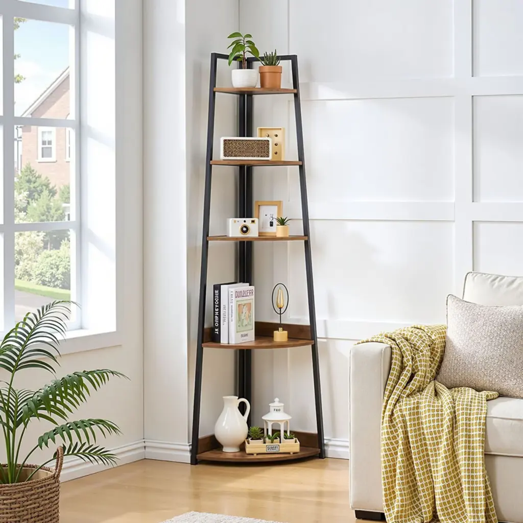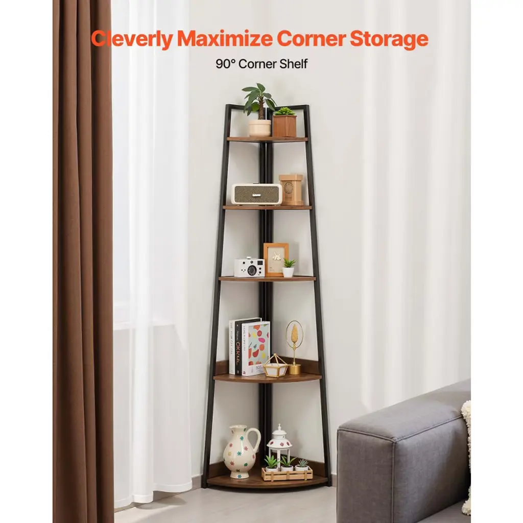 Vevor 5 Tier Corner Shelf, 70" Tall Corner Bookshelf With Metal Frame & Wooden Shelves, Industrial Corner Ladder Shelf For Living Room, Brown