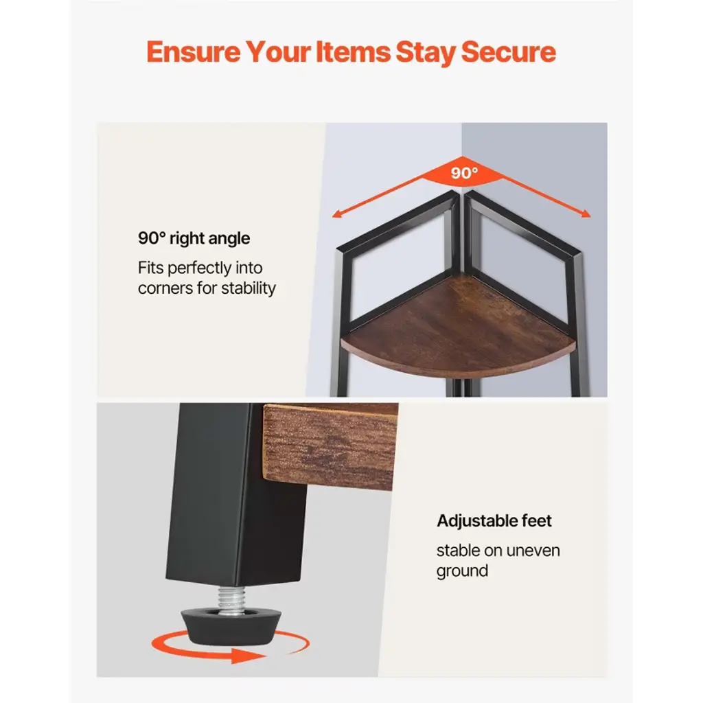 Feature: Large Capacity Storage: Designed specifically for corners with a trapezoidal shape, this corner bookshelf features vertical, tiered storage, providing ample space for your various items. You can organize headphones, books, artwork, small plants, and more, displaying them beautifully while saving time when looking for items High-Quality Materials: Made from durable MDF boards and sturdy metal, the reinforced shelves are thickened to 0.6 in / 1.5 cm, and the metal frame is strengthened to 0.8 in / 2 cm, ensuring each shelf can hold up to 60 lbs / 27 kg of weight. The material is scratch-resistant, wear-resistant, and moisture-resistant, ensuring long-lasting stability and durability without easily warping Stable & Secure Structure: The unique 90° right-angle design fits into the corners of different rooms, ensuring it stays close to the wall for stability and space-saving. The adjustable feet can adapt to uneven floors or carpets, ensuring the shelf remains stable in various environments Anti-Tip Devices: Includes both strap-style and suction cup-style anti-tip devices, which are compatible with various wall types such as tile, wood, and cement. You can choose the most suitable device based on your wall surface to securely fix the shelf. Please ensure the anti-tip devices are installed before use Easy Assembly & Maintenance: This corner bookcase comes with all necessary accessories and assembly instructions, making the setup process simple. The shelves are moisture-resistant and easy to clean, requiring only a damp cloth for regular maintenance. Note: Due to lighting conditions and differences in viewing devices, there may be slight color variations between the actual product Package Content 1 x Corner Bookshelf Set 1 x Instruction Manual