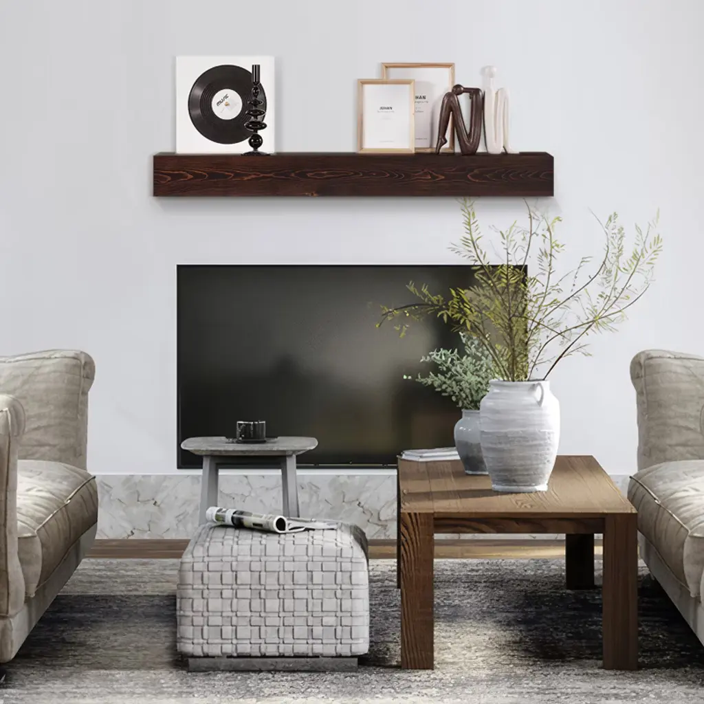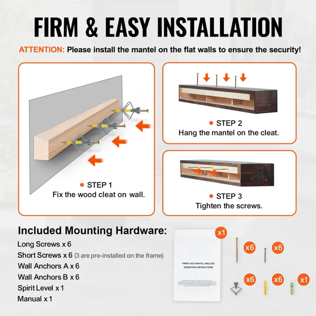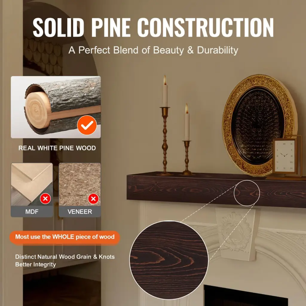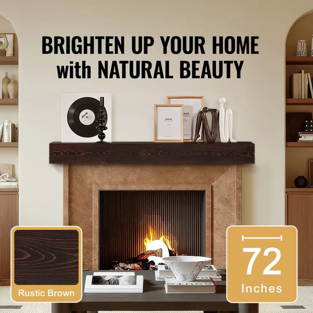 Feature: Classic & Stylish: Elevate your living space with the natural charm and elegance of our fireplace mantel. Its unique color complements a variety of home decor styles, adding warmth and character to any room. Know Your Mantel: This floating mantel shelf is available in a rustic brown color and measures 72 inches in length. With a weight capacity of 50 lbs, it's sturdy enough to display your favorite decor items, from family photos to cherished keepsakes. Solid Pine Wood: Crafted from real white pine wood, our mantel shelf offers a perfect blend of beauty and durability. Unlike MDF or veneer alternatives, it features distinct natural wood grain and knots, providing better integrity and a truly authentic look. Most use the whole piece of wood, ensuring a robust and durable structure. Easy to Install: For secure and straightforward installation, please ensure the wood mantel is mounted on flat walls. All necessary mounting hardware is included, making the assembly process quick and hassle-free. Versatile Display: This fireplace shelf is ideal for a wide range of settings, from traditional living rooms to modern apartments. Its timeless design makes it suitable for enhancing any fireplace, creating a focal point that is both functional and visually appealing. Package Content 1 x Mantel Shelf 6 x Long Screws 6 x Short Screws (3 are pre-installed on the frame) 6 x Wall Anchors A 6 x Wall Anchors B 1 x Spirit Level 1 x User Manual