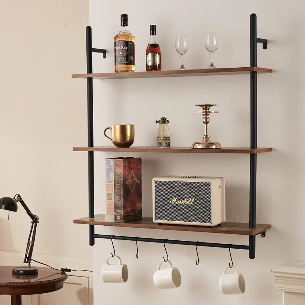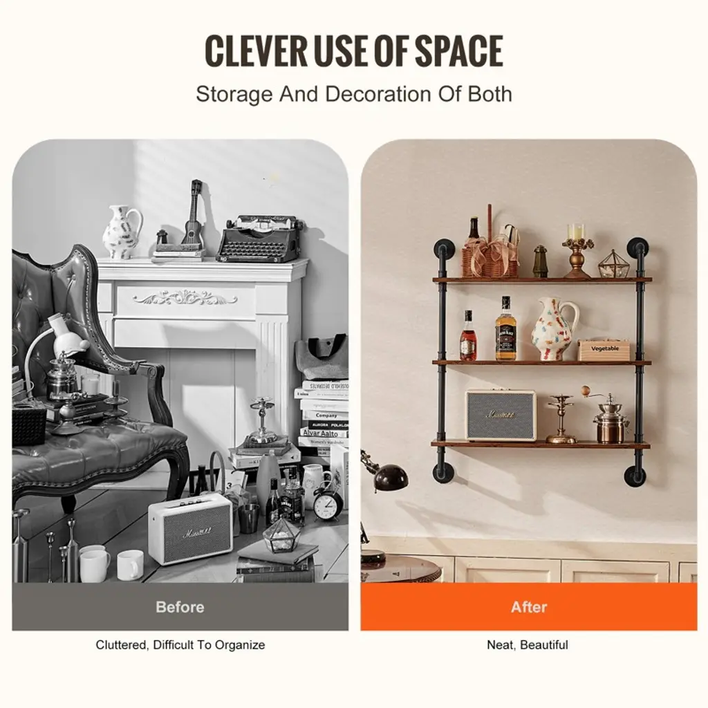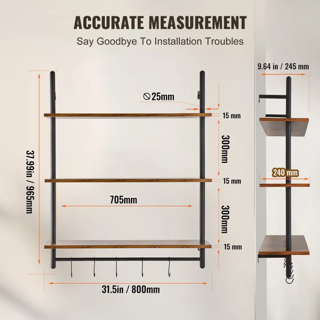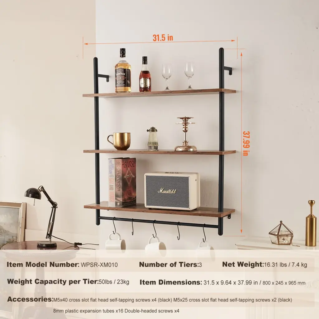 Feature: Strong Weight Bearing: Adopting sturdy metal tube structure with thickened wooden boards, each layer can bear up to 50 pounds, which can meet a variety of storage needs; whether it's books, photo frames, artifacts, or kitchen utensils, bathroom towels, they can all be easily stored, so that your space is well organized, say goodbye to the clutter! Hard Steel Tube: ∅1“ carbon steel round tube, strong bearing force is not easy to break, to bring you a safe and stable storage experience.0.6” thickened wooden boards to provide you with sufficient gravity, easy to place all kinds of items, say goodbye to the easy to bend, poor material trouble. Flexible Use: The pipe shelf is designed to be flexible and can be installed on any wall to make full use of space. Whether it is a dining bar, laundry room, living room or study, it can be easily installed to add storage function to your space. Easy Organization: Cleverly use the wall space to store and organize the sundries, make your space more neat and beautiful. Simple to install, no tools required, easy to solve the storage problem. At the same time, the shelf itself also has a decorative function, storage at the same time to enhance the taste of the space, so that the home renewed vigor. Accurate Measurement: our metal pipe shelves are 38“ in height, each tier is 12” high, you can measure the installation position to see if it is suitable before purchasing. Package Content Pipe Shelves x 1 M5x40 cross slot flat head self-tapping screws x4 (black) M5x25 cross slot flat head self-tapping screws x2 (black) 8mm plastic expansion tubes x16 Double-headed screws x4