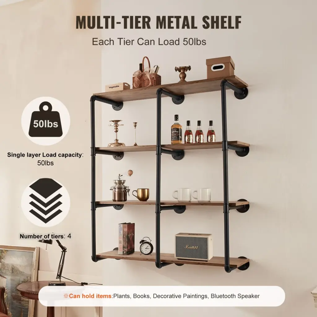 Vevor Industrial Pipe Shelf, 4 Tier 3Pcs, 11.8in Applicable Board Width Wall-mount Floating Rustic Wood Shelves Bracket Bookshelf, Black