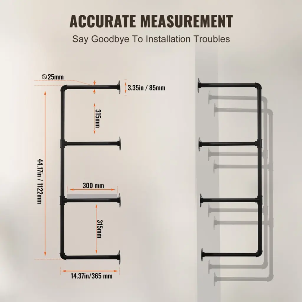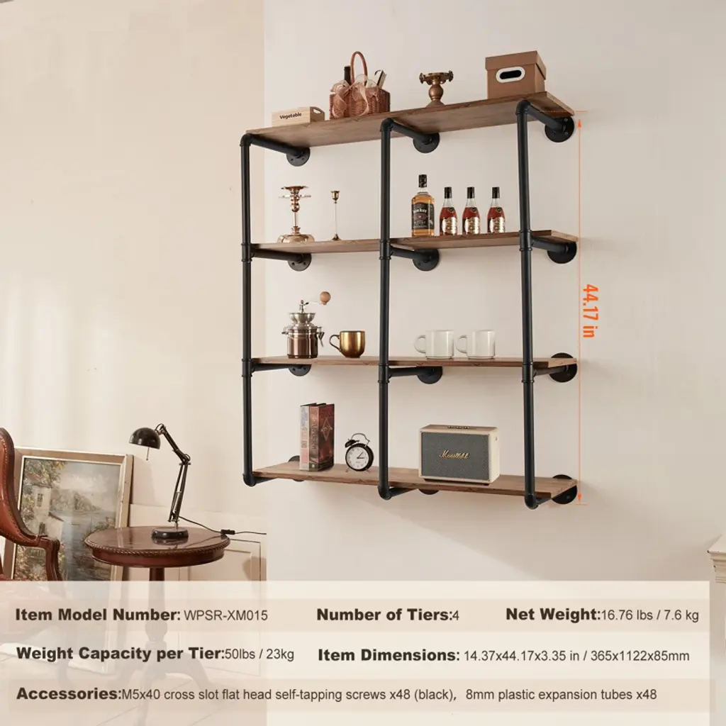 Feature: Strong Weight Bearing: Adopting sturdy metal tube structure , each layer can bear up to 50 pounds, which can meet a variety of storage needs; whether it's books, photo frames, artifacts, or kitchen utensils, bathroom towels, they can all be easily stored, so that your space is well organized, say goodbye to the clutter! Hard Steel Tube: ∅1“ carbon steel round tube, strong bearing force is not easy to break, to bring you a safe and stable storage experience. 0.6” thickened wooden boards (sold separately) to provide you with sufficient gravity, easy to place all kinds of items, say goodbye to the easy to bend, poor material trouble. Flexible Use: The pipe shelf is designed to be flexible and can be installed on any wall to make full use of space. Whether it is a dining bar, laundry room, living room or study, it can be easily installed to add storage function to your space. Easy Organization: Cleverly use the wall space to store and organize the sundries, make your space more neat and beautiful. Simple to install, no tools required, easy to solve the storage problem. At the same time, the shelf itself also has a decorative function, storage at the same time to enhance the taste of the space, so that the home renewed vigor. Accurate Measurement: our metal pipe shelves are 44" in height and 14” in height per tier, you can measure whether the installation position is suitable before purchasing. Package Content Shelf Pipes x 3 M5x40 cross slot flat head self-tapping screws x48 (black) 8mm plastic expansion tubes x48
