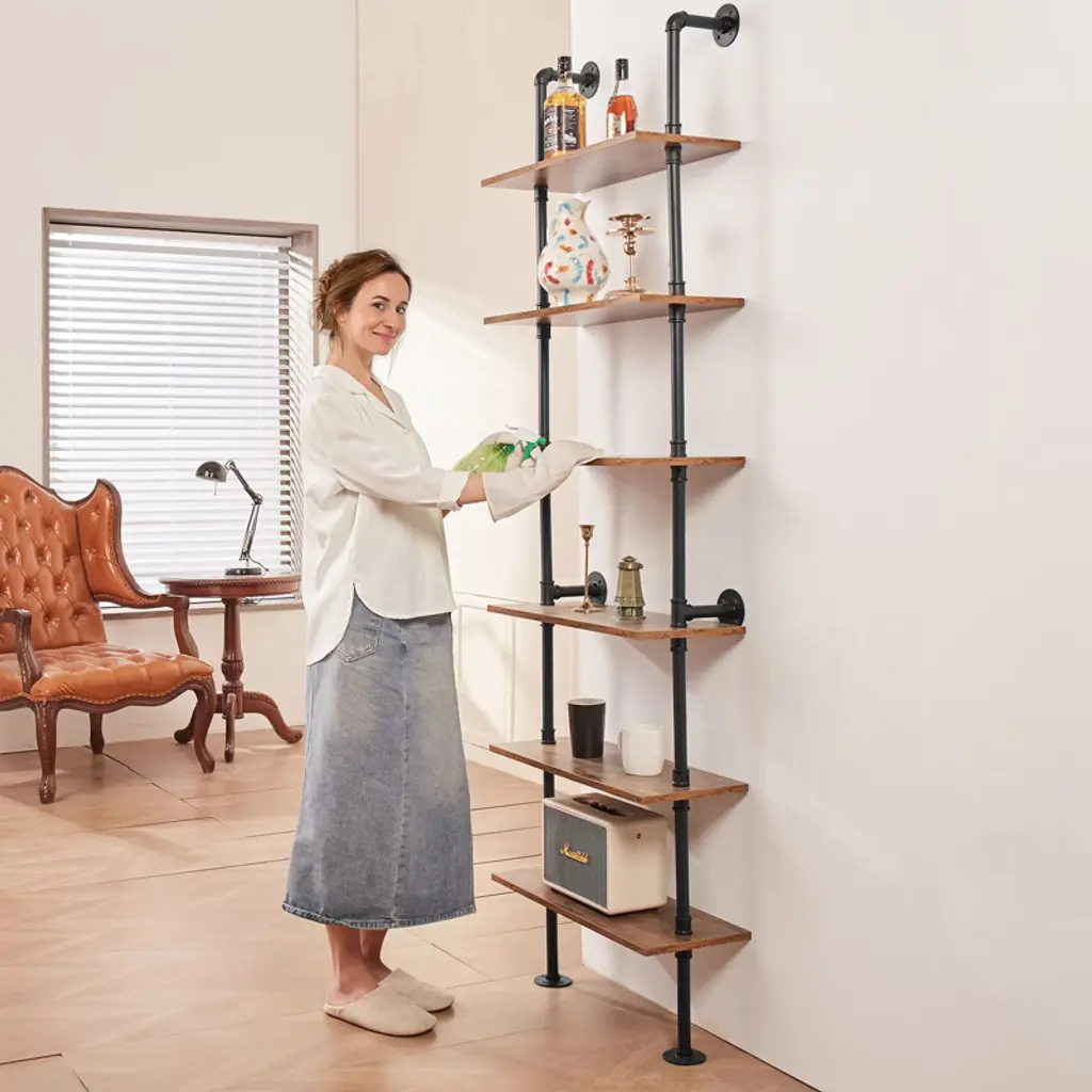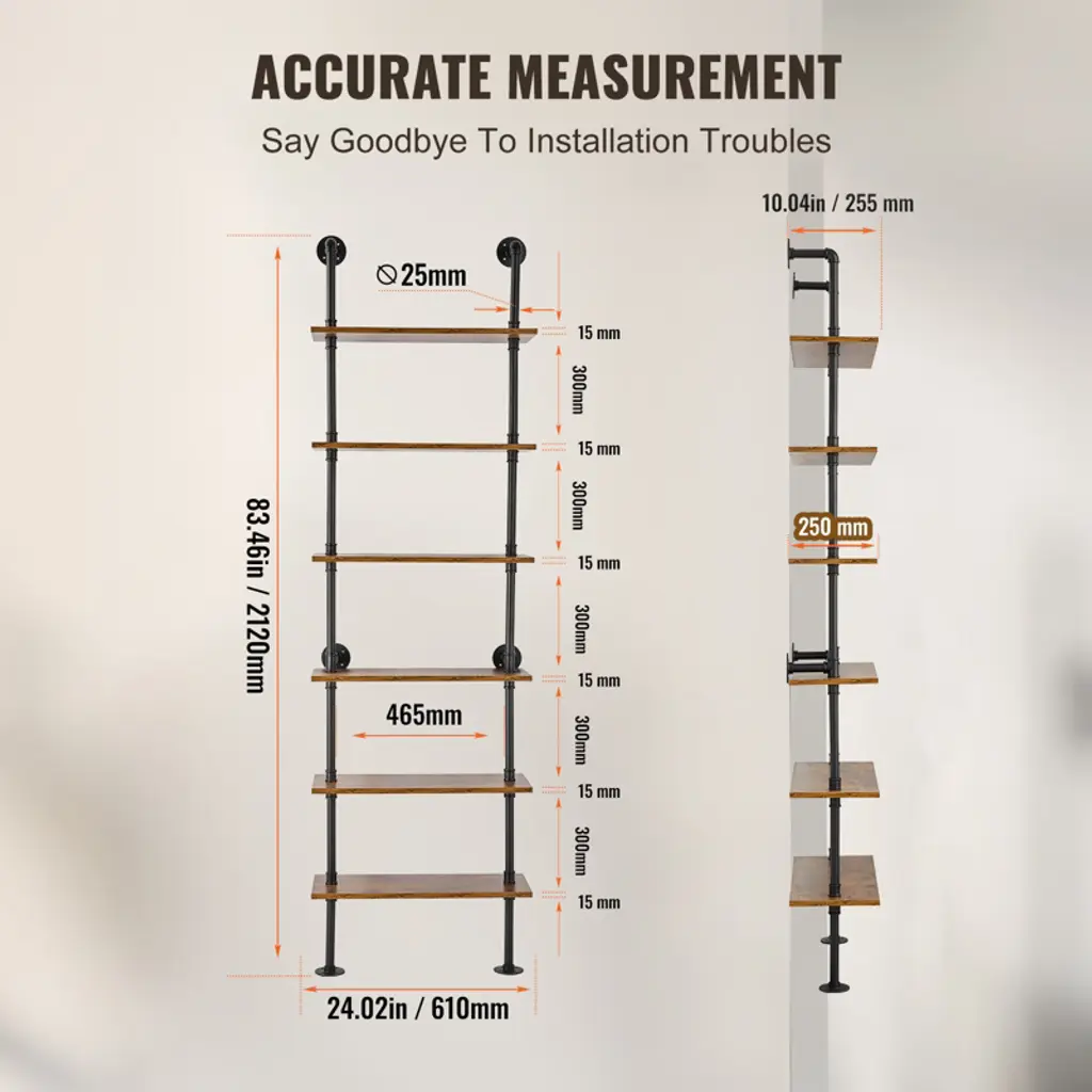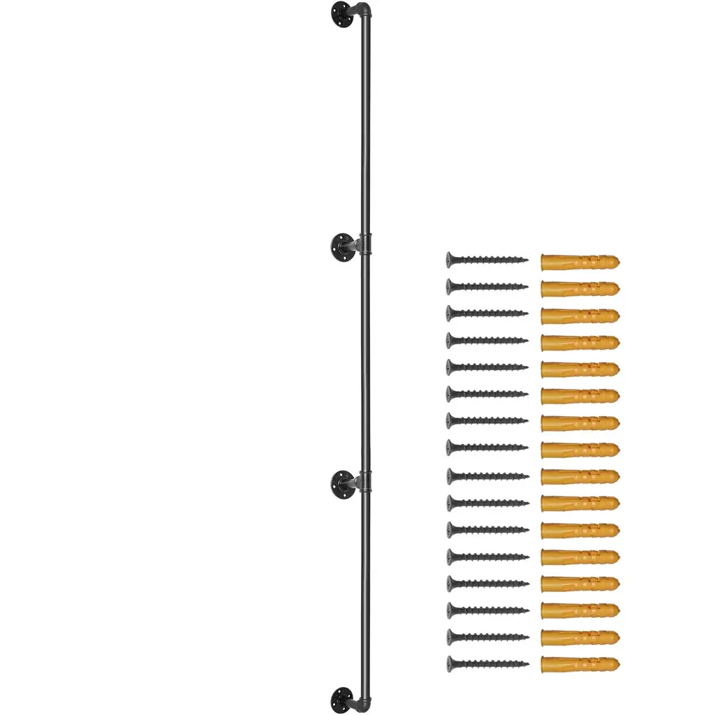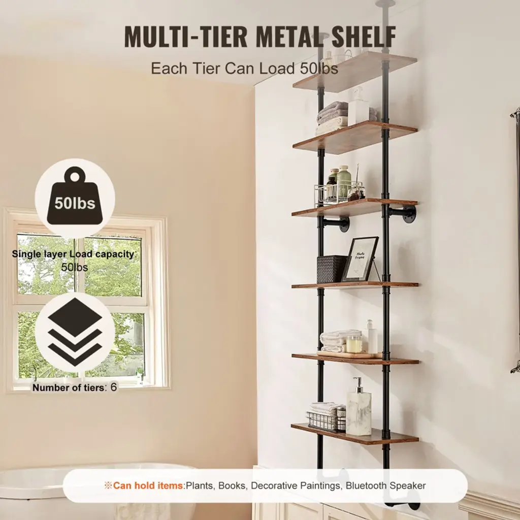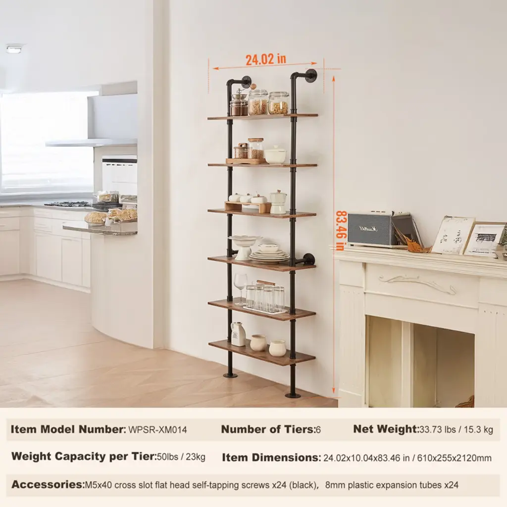 Feature: Strong Weight Bearing: Adopting sturdy metal tube structure with thickened wooden boards, each layer can bear up to 50 pounds, which can meet a variety of storage needs; whether it's books, photo frames, artifacts, or kitchen utensils, bathroom towels, they can all be easily stored, so that your space is well organized, say goodbye to the clutter! Hard Steel Tube: ∅1“ carbon steel round tube, strong bearing force is not easy to break, to bring you a safe and stable storage experience.0.6” thickened wooden boards to provide you with sufficient gravity, easy to place all kinds of items, say goodbye to the easy to bend, poor material trouble. Flexible Use: The pipe shelf is designed to be flexible and can be installed on any wall to make full use of space. Whether it is a dining bar, laundry room, living room or study, it can be easily installed to add storage function to your space. Easy Organization: Cleverly use the wall space to store and organize the sundries, make your space more neat and beautiful. Simple to install, no tools required, easy to solve the storage problem. At the same time, the shelf itself also has a decorative function, storage at the same time to enhance the taste of the space, so that the home renewed vigor. Accurate Measurement: our metal pipe shelves are 83.5" in height and 12” in height per tier, you can measure whether the installation position is suitable before purchasing. Package Content Pipe Shelves x 1 M5x40 cross slot flat head self-tapping screws x24 (black) 8mm plastic expansion tubes x24