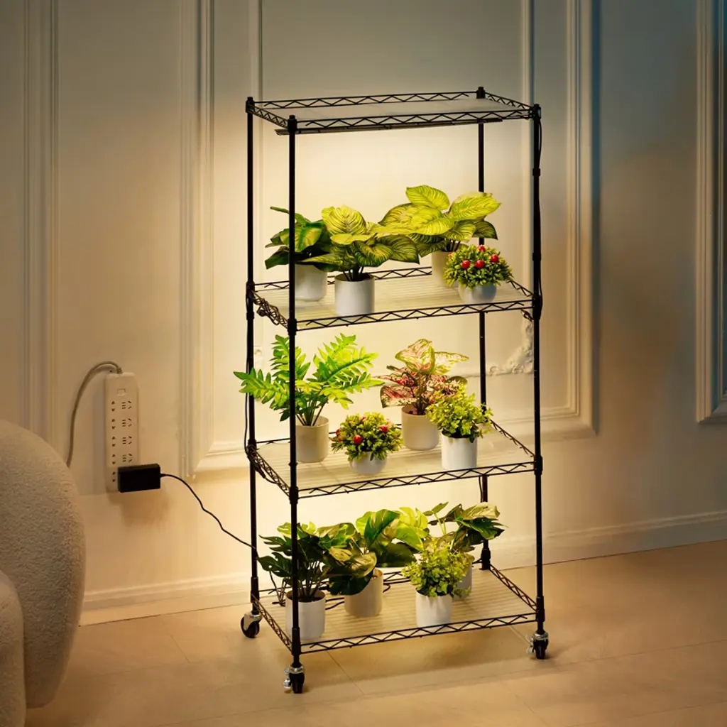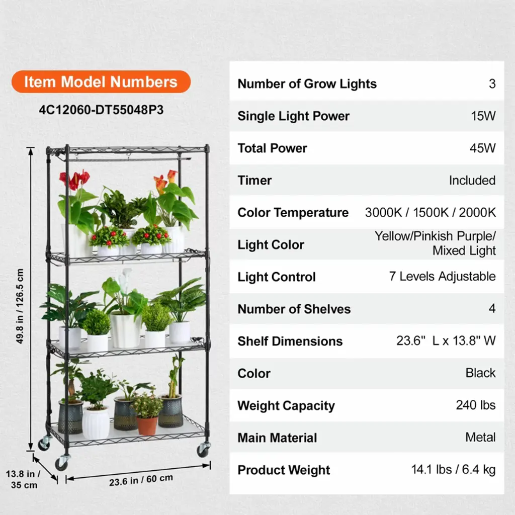 Feature: Sturdy Plant Growth Rack: This high-density steel plant shelf with grow light boasts excellent rust and oxidation resistance, with dimensions of 23.6 x 13.8 x 49.8 in, and features 4 shelves measuring 23.6 x 13.8 in each. It supports up to 240 lbs, allowing you to vertically display multiple plants in a compact space. Equipped with three adjustable light settings, simply press the controller to start your planting journey. Three Spectrum Light Modes: Featuring 3 spectrum design with three panels totaling 45W, this plant stand with grow light mimics natural sunlight. It offers three color temperature options—warm yellow, pink, and mixed color—ideal for seedlings, growth, and flowering stages, ensuring optimal conditions for plant development. 7-Level Intensity & Timer: Our plant grow shelf includes seven light intensity settings with seamless dimming functionality. Customize the light intensity for your plants and use the 3/6/12-hour timer settings to ensure they receive the appropriate light exposure. Convenient & Secure Design: The metal plant stand rack with adjustable grid height accommodates various plant sizes. The four sturdy industrial wheels make moving the rack easy. The PP mat’s leak-proof design avoid the lights from water damage, ensuring a worry-free experience. Easy Assembly: The durable plant holder rack with plant light with enhanced component connection structure and cylindrical design features for precise assembly guidance, simplifying the setup process. Package Content 1 x Plant Stand with Grow Light