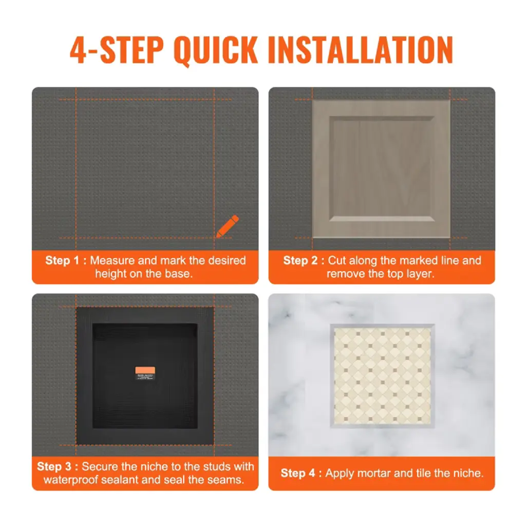 Feature: Sealed and 100% Waterproof: VEVOR shower bays use XPS extruded foam board, cement mortar, waterproof coating triple waterproof substrate, 100% sealed and waterproof, which not only can protect the wall and extend the service life of the wall but also effectively prevent water penetration into the wall, keep the indoor dry and sanitary. NOTE: This product is not for direct use. Surface layer, like tile, must be applied to the surface before use!!! High-Quality Material: The (HCFC-free) XPS extruded foam board is durable and not susceptible to decomposition, decay. At the same time, the XPS foam board is relatively lightweight and can be easily carried, lifted, and easy to place. Multi-process: The surface adopts a double-layer cement mortar + glass fiber mesh cloth reinforcement process, which has more muscular rigidity and better load-bearing force and can withstand 62kg/m²; Glass fiber mesh cloth + cement mortar + waterproof coating surface process to bring grid rough surface, suitable for any tile adhesive, strong adsorption, solid tile bonding. Easy Installation: Equipped with a complimentary installation kit, horizontal or vertical embedded installation, you only need to follow the following steps to complete. These shower niche shelves can be installed without complicated procedures. Friendly Note: This product is not ready for direct use and requires the application of protective materials, such as tiles, on the surface before use. Widely Used: The overall size is 16x16x4 inches (40.64x40.64x10 cm), does not occupy the building area, is more convenient to use, not only for the bathroom but also for cabinets, bookshelves, kitchens, etc., can meet the needs of multi-scene niches. Package Content 1 x Shower Niche 8 x Stainless Steel Claws With Washers 8 x Stainless Steel Screws