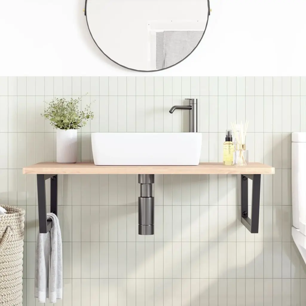 The wall mounted basin shelf securely attaches to the wall, providing an elegant and space-saving solution for your bathroom. Sturdy and long-lasting: This basin shelf is combined with a steel structure and a solid beech wood top, making it sturdy, stable, and long-lasting. Space-saving: The floating basin shelf has ample space to store creams and small items. Thanks to the trapezium shape, you can hang towels or other things on the support to save space. Easy to use: The countertop comes undrilled to allow the basin to be mounted on the left, right, or in the centre, depending on your room's requirements. Thanks to the pre-drilled holes in the holder, it can be easily assembled with the tabletop and mounted on the wall. Wide applications: Thanks to its modern design, it provides additional space for various types of bathrooms. Good to know:Screws are not included, you can purchase the screws separately based on the information provided below. Wall attachment: 2 pcs M8 expansion screws per bracket Wooden top: 2 pcs M5x18 screws (T=2) or 2 pcs M5x20 screws (T=2,5/1.6 ") per bracket