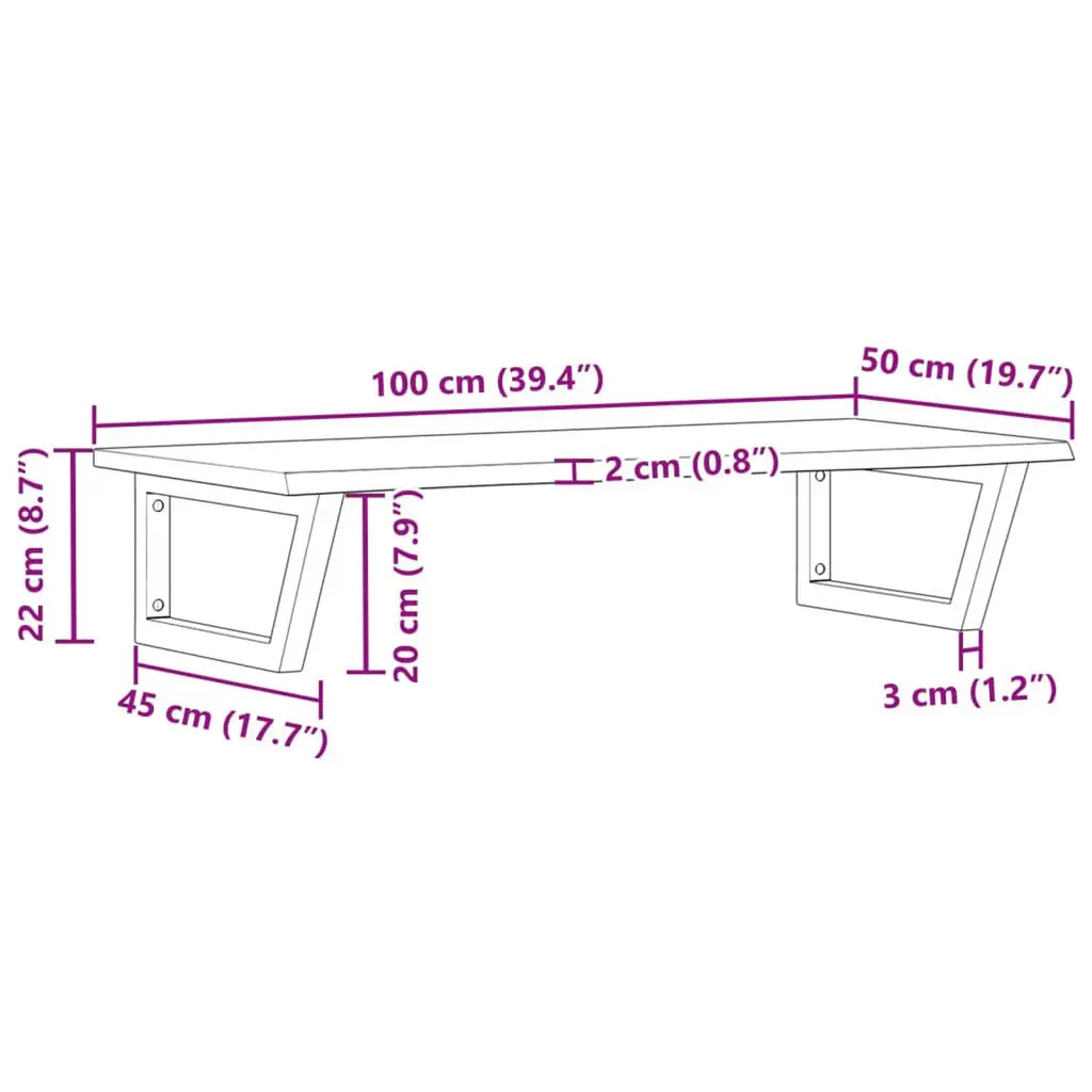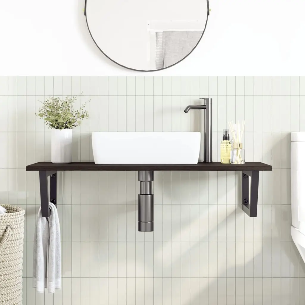 The wall mounted basin shelf securely attaches to the wall, providing an elegant and space-saving solution for your bathroom.Sturdy and long-lasting: This basin shelf is combined with a steel structure and a solid oak wood top, making it sturdy, stable, and long-lasting.Space-saving: The floating basin shelf has ample space to store creams and small items. Thanks to the trapezium shape, you can hang towels or other things on the support to save space.Easy to use: The countertop comes undrilled to allow the basin to be mounted on the left, right, or in the centre, depending on your room's requirements. Thanks to the pre-drilled holes in the holder, it can be easily assembled with the tabletop and mounted on the wall.Wide applications: Thanks to its modern design, it provides additional space for various types of bathrooms.Good to know:Screws are not included, you can purchase the screws separately based on the information provided below.Wall attachment: 2 pcs M8 expansion screws per bracketWooden top: 2 pcs M5x18 screws (T=2) or 2 pcs M5x20 screws (T=2,5/1.6 ") per bracketAs a natural product, wood may show knots and imperfections that we fill with black fillings to ensure a smooth appearance.