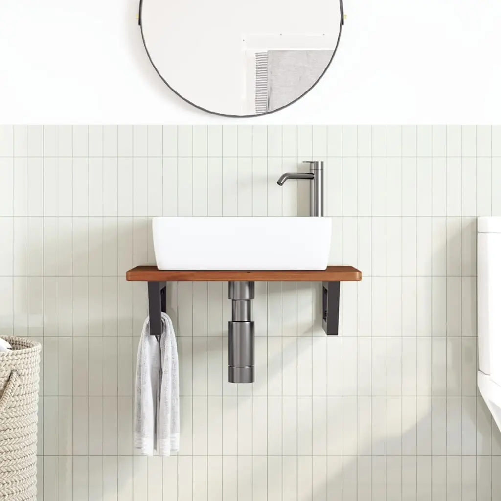 The wall mounted basin shelf securely attaches to the wall, providing an elegant and space-saving solution for your bathroom. Sturdy and long-lasting: This basin shelf is combined with a steel structure and a solid oak wood top, making it sturdy, stable, and long-lasting. Space-saving: The floating basin shelf has ample space to store creams and small items. Thanks to the trapezium shape, you can hang towels or other things on the support to save space. Easy to use: The countertop comes undrilled to allow the basin to be mounted on the left, right, or in the center, depending on your room's requirements. Thanks to the pre-drilled holes in the holder, it can be easily assembled with the tabletop and mounted on the wall. Wide applications: Thanks to its modern design, it provides additional space for various types of bathrooms. Good to know:Screws are not included, you can purchase the screws separately based on the information provided below. Wall attachment: 2 pcs M8 expansion screws per bracket Wooden top: 2 pcs M5x18 screws (T=2) or 2 pcs M5x20 screws (T=1"/1.6") per bracket