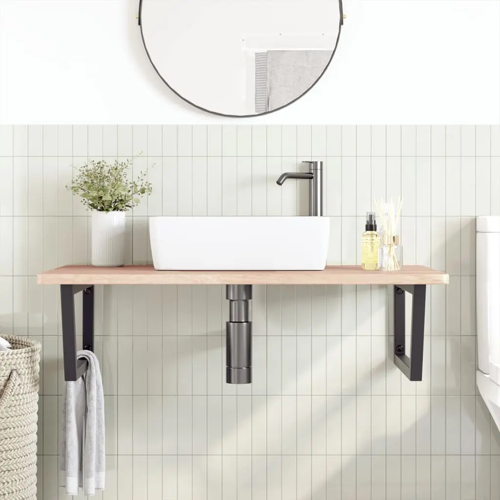 The wall mounted basin shelf securely attaches to the wall, providing an elegant and space-saving solution for your bathroom. Sturdy and long-lasting: This basin shelf is combined with a steel structure and a solid oak wood top, making it sturdy, stable, and long-lasting. Space-saving: The floating basin shelf has ample space to store creams and small items. Thanks to the trapezium shape, you can hang towels or other things on the support to save space. Easy to use: The countertop comes undrilled to allow the basin to be mounted on the left, right, or in the centre, depending on your room's requirements. Thanks to the pre-drilled holes in the holder, it can be easily assembled with the tabletop and mounted on the wall. Wide applications: Thanks to its modern design, it provides additional space for various types of bathrooms. Good to know:Screws are not included, you can purchase the screws separately based on the information provided below. Wall attachment: 2 pcs M8 expansion screws per bracket Wooden top: 2 pcs M5x18 screws (T=2) or 2 pcs M5x20 screws (T=2,5/1.6 ") per bracket