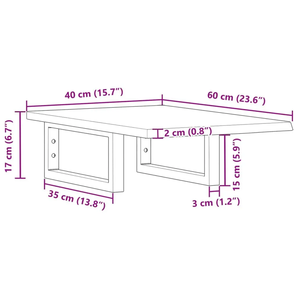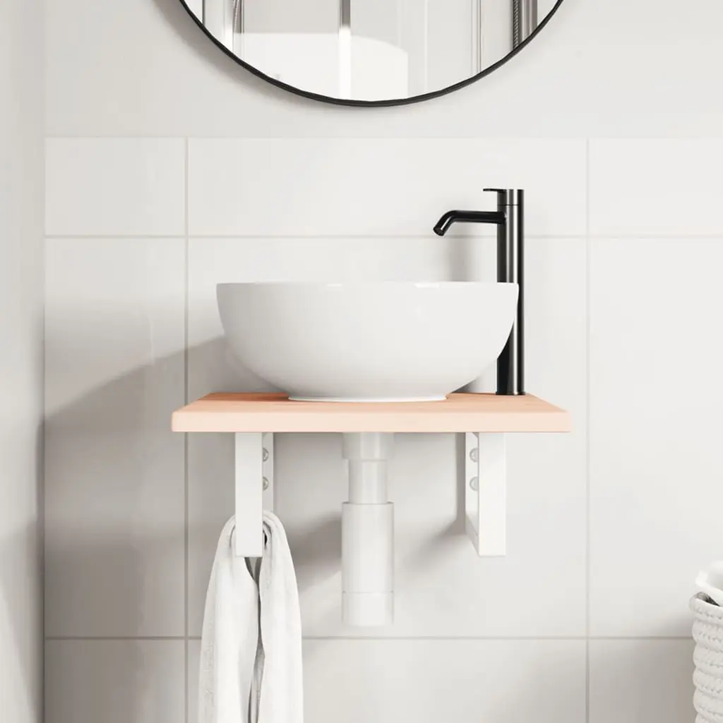 The wall mounted basin shelf securely attaches to the wall, providing an elegant and space-saving solution for your bathroom.Sturdy and long-lasting: This basin shelf is combined with a steel structure and a solid oak wood top, making it sturdy, stable, and long-lasting.Space-saving: The floating basin shelf has ample space to store creams and small items. Thanks to the rectangular shape, you can hang towels or other things on the support to save space.Easy to use: The countertop comes undrilled to allow the basin to be mounted on the left, right, or in the centre, depending on your room's requirements. Thanks to the pre-drilled holes in the holder, it can be easily assembled with the tabletop and mounted on the wall.Wide applications: Thanks to its modern design, it provides additional space for various types of bathrooms.Good to know:Screws are not included, you can purchase the screws separately based on the information provided below.Wall attachment: 2 pcs M8 expansion screws per bracketWooden top: 2 pcs M5x18 screws (T=2) or 2 pcs M5x20 screws (T=2,5/1.6 ") per bracketAs a natural product, wood may show knots and imperfections that we fill with black fillings to ensure a smooth appearance.