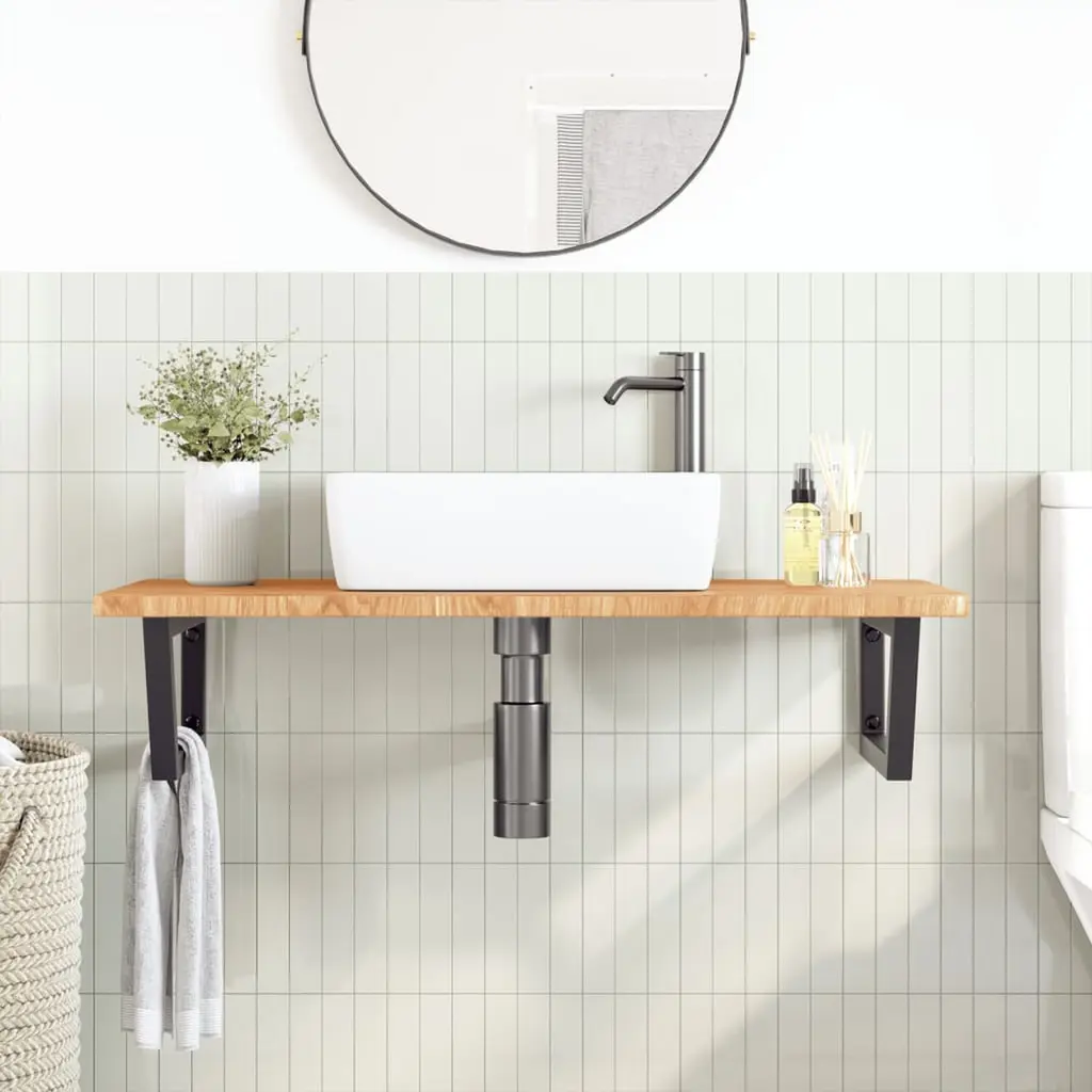 The wall mounted basin shelf securely attaches to the wall, providing an elegant and space-saving solution for your bathroom. Sturdy and long-lasting: This basin shelf is combined with a steel structure and a solid oak wood top, making it sturdy, stable, and long-lasting. Space-saving: The floating basin shelf has ample space to store creams and small items. Thanks to the trapezium shape, you can hang towels or other things on the support to save space. Easy to use: The countertop comes undrilled to allow the basin to be mounted on the left, right, or in the center, depending on your room's requirements. Thanks to the pre-drilled holes in the holder, it can be easily assembled with the tabletop and mounted on the wall. Wide applications: Thanks to its modern design, it provides additional space for various types of bathrooms. Good to know:Screws are not included, you can purchase the screws separately based on the information provided below. Wall attachment: 2 pcs M8 expansion screws per bracket Wooden top: 2 pcs M5x18 screws (T=2) or 2 pcs M5x20 screws (T=1"/1.6") per bracket