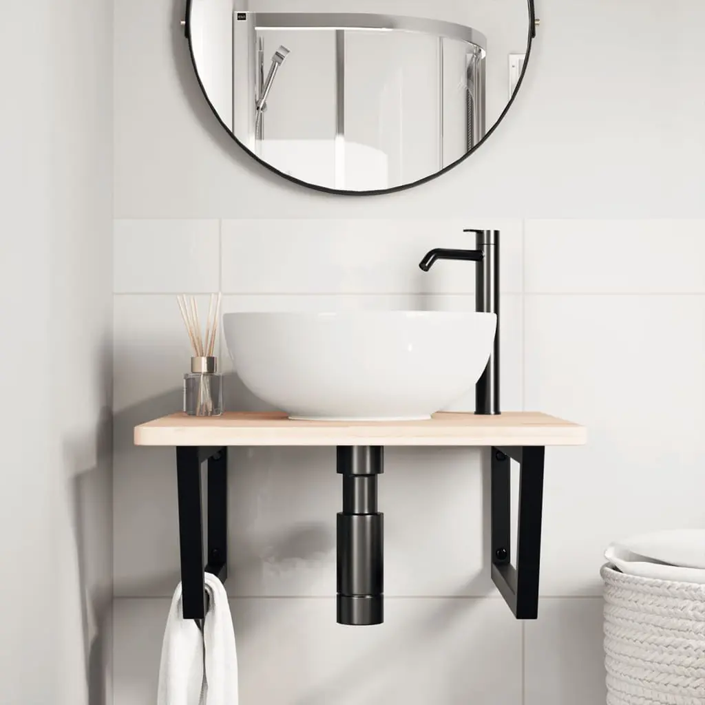 The wall mounted basin shelf securely attaches to the wall, providing an elegant and space-saving solution for your bathroom. Sturdy and long-lasting: This basin shelf is combined with a steel structure and a solid oak wood top, making it sturdy, stable, and long-lasting. Space-saving: The floating basin shelf has ample space to store creams and small items. Thanks to the trapezium shape, you can hang towels or other things on the support to save space. Easy to use: The countertop comes undrilled to allow the basin to be mounted on the left, right, or in the centre, depending on your room's requirements. Thanks to the pre-drilled holes in the holder, it can be easily assembled with the tabletop and mounted on the wall. Wide applications: Thanks to its modern design, it provides additional space for various types of bathrooms. Good to know:Screws are not included, you can purchase the screws separately based on the information provided below. Wall attachment: 2 pcs M8 expansion screws per bracket Wooden top: 2 pcs M5x18 screws (T=2) or 2 pcs M5x20 screws (T=2,5/1.6 ") per bracket