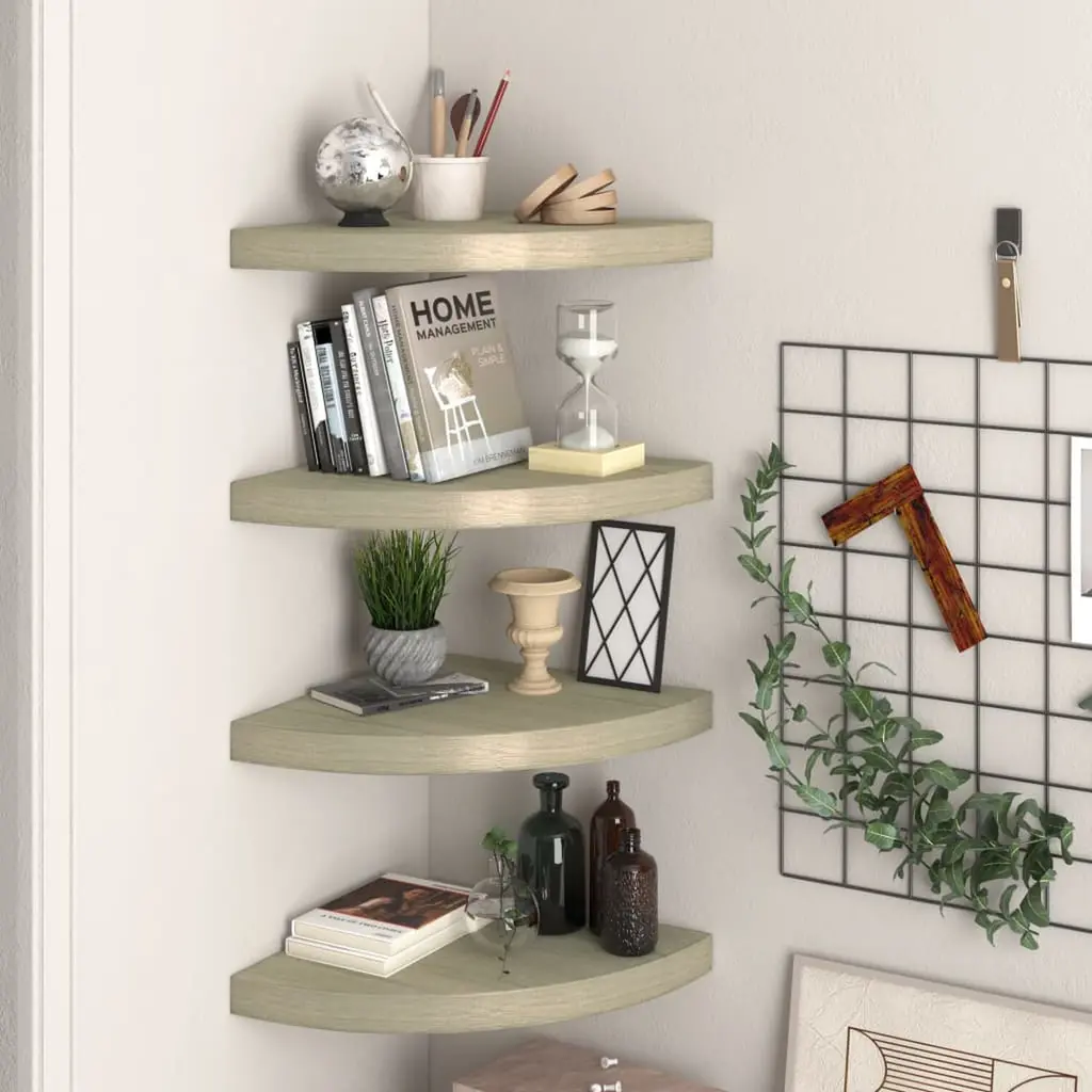 This Floating Corner Shelf set beautifully enhances any room by utilizing often-overlooked corner spaces. Finished in elegant oak, the triangular shape makes the most of your layout and adds a stylish touch to your decor, perfect for merging practicality with aesthetics. Triangular Shape: Designed to fit snugly into corners, maximizing space usage in smaller areas. The clever design allows a smooth integration into your home.Durable MDF Construction: Made from top-quality engineered wood, these shelves offer stability and strength, comfortably holding decorative items and books without sagging.Minimalist Aesthetic: The wood-like finish provides a sleek, modern look, adding a refined touch to any room, making them perfect for contemporary homes.Simple Installation: All components and instructions are included, so you can easily mount these shelves with minimal effort. The invisible mounting system keeps them looking like they’re floating against the wall for a clean, unobtrusive look.Multi-Purpose Use: Great for the living room, bedroom, or office, these corner shelves enhance your home while offering a space to display books, photos, or decor.