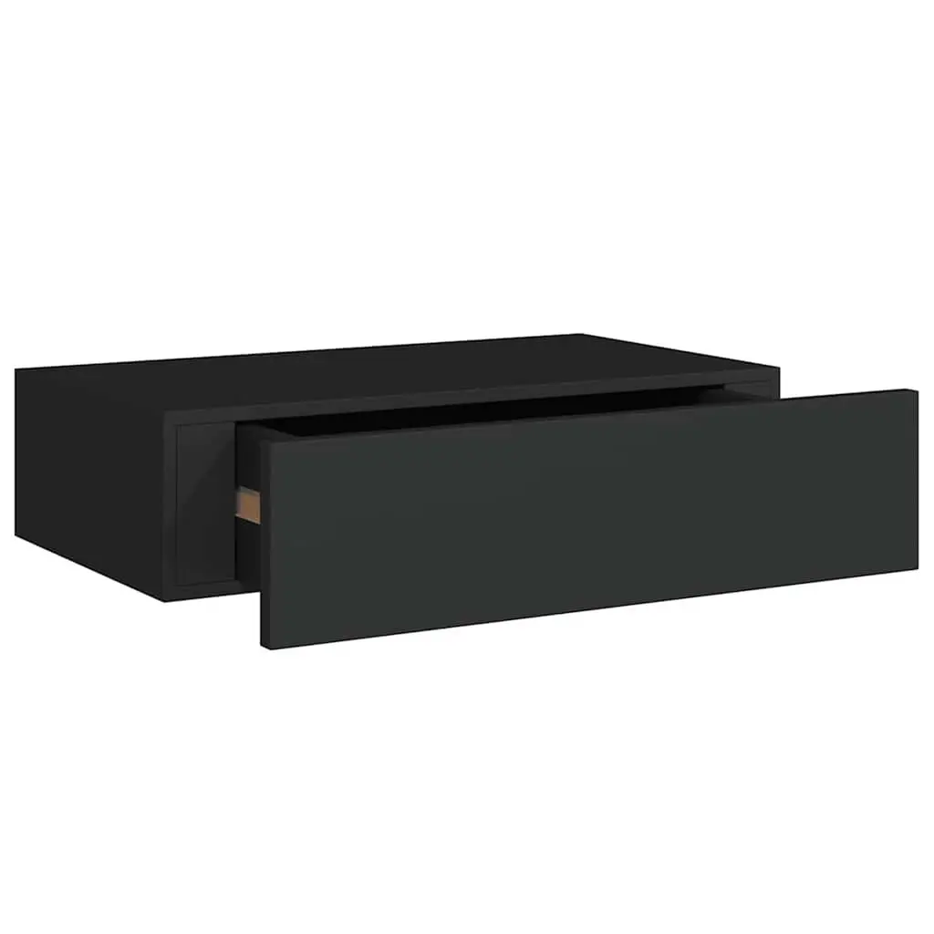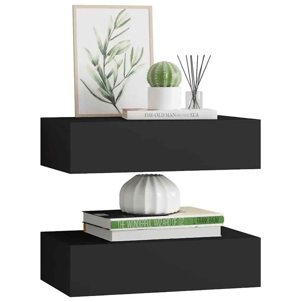 This wall-mounted drawer shelf set gives you a sleek, modern way to store and display items in style. The black MDF shelves create a perfect backdrop for your picture frames, small plants, and collectibles. These stylish yet practical pieces will enhance any room's decor with their smooth, matte finish and minimalist design, fitting seamlessly into any interior style. Compact Dimensions: At 15.7 in long, 9.3 in wide, and 3.9 in high, these shelves are ideal for tight spaces while providing ample room for your items. Easy Installation: The package includes all necessary mounting hardware and straightforward instructions for easy assembly. Versatile Decorations: Suitable for various settings, use them in living rooms, bedrooms, or hallways to enhance your decor. Robust Weight Capacity: Each shelf can hold up to 22 pounds, making it a reliable option for lightweight decor and various items. Stylish Finishing: The matte black finish adds a touch of sophistication to any wall.