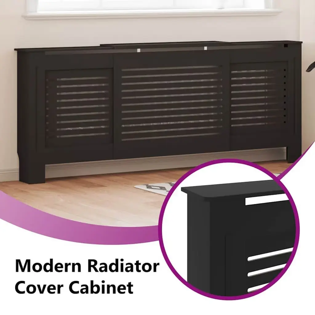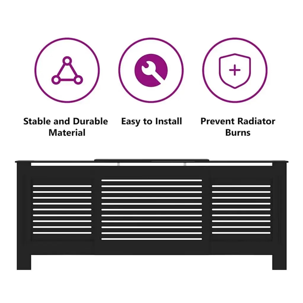 This radiator cover is designed to add both style and safety to your home or office, while also providing extra shelf space for books, photo frames, and decorative items. Its modern slatted design and engineered wood construction make it a versatile and attractive addition to any room.Key Features • Made from durable engineered wood (MDF) with a smooth, matte or lacquer finish• Modern horizontal slatted design allows for efficient airflow• Top shelf offers additional space for display or storage• Shields hot surfaces to help protect children and pets from burns• Easy assembly with clear, step-by-step instructionsSafety & Functionality • Reduces the risk of accidental burns by covering exposed radiators• Prevents direct contact with hot surfaces, enhancing safety for families• Adds a decorative touch to your living space while maintaining functionalityAvailable Sizes & Colors • Sizes: 30.7" x 7.5" x 32.1", 44.1" x 7.5" x 32.1", 59.8" x 7.5" x 32.1", 80.7" x 8.1" x 32.1"• Colors: Black, Brown, Gray, WhiteProduct Details • Material: Engineered wood• Distance between horizontal slats: 1.1"• Number of horizontal slats: 7• Assembly required: YesThis radiator cover is a practical and stylish solution for concealing radiators, enhancing room aesthetics, and providing additional storage or display space. Choose from multiple sizes and colors to best fit your décor and radiator dimensions.