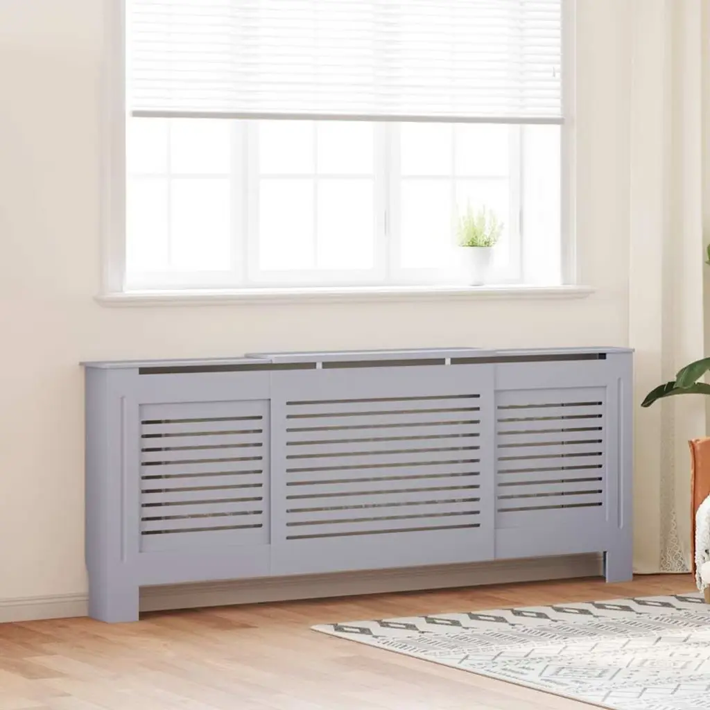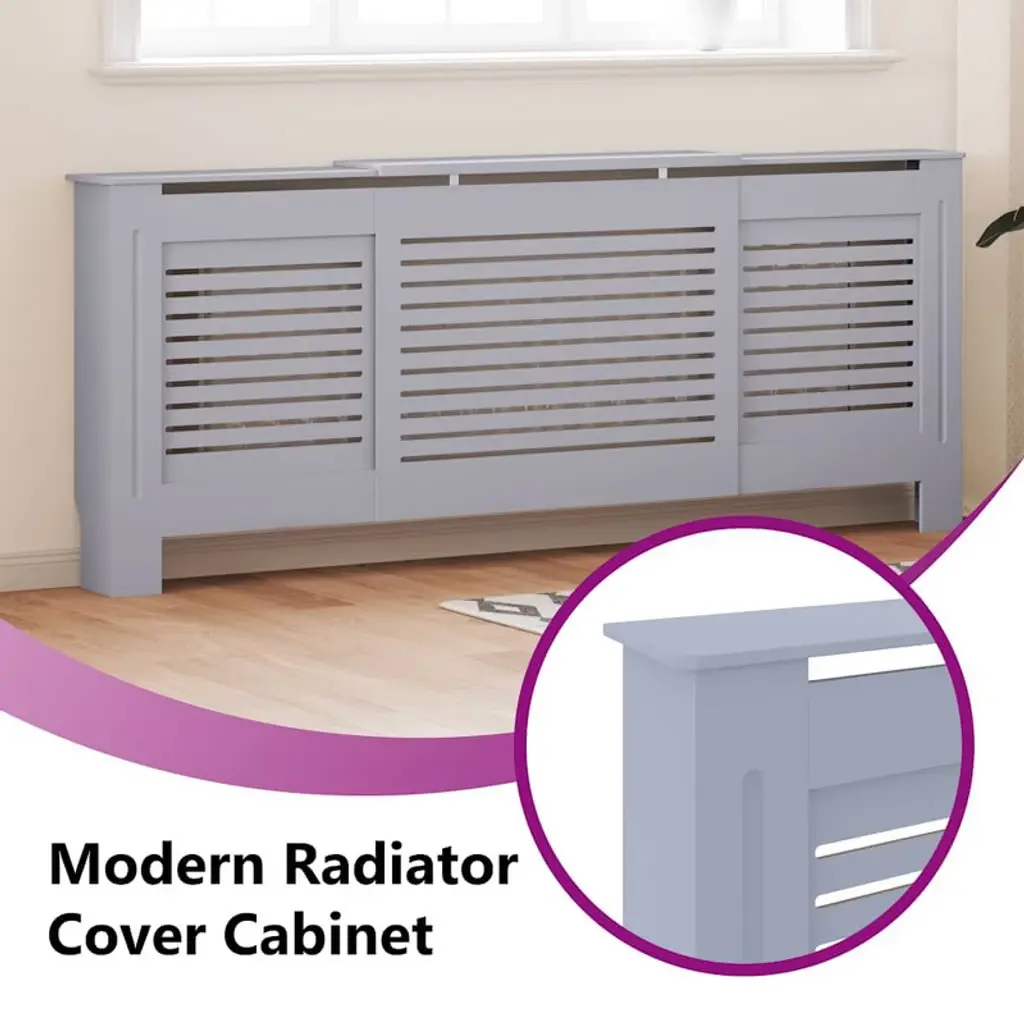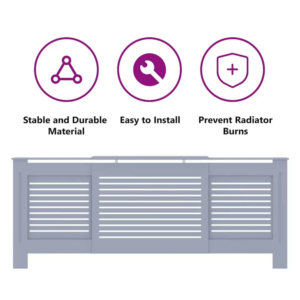 This radiator cover is designed to add both style and safety to your home or office, while also providing extra shelf space for books, photo frames, and decorative items. Its modern slatted design and engineered wood construction make it a versatile and attractive addition to any room.Key Features • Made from durable engineered wood (MDF) with a smooth, matte or lacquer finish• Modern horizontal slatted design allows for efficient airflow• Top shelf offers additional space for display or storage• Shields hot surfaces to help protect children and pets from burns• Easy assembly with clear, step-by-step instructionsSafety & Functionality • Reduces the risk of accidental burns by covering exposed radiators• Prevents direct contact with hot surfaces, enhancing safety for families• Adds a decorative touch to your living space while maintaining functionalityAvailable Sizes & Colors • Sizes: 30.7" x 7.5" x 32.1", 44.1" x 7.5" x 32.1", 59.8" x 7.5" x 32.1", 80.7" x 8.1" x 32.1"• Colors: Black, Brown, Gray, WhiteProduct Details • Material: Engineered wood• Distance between horizontal slats: 1.1"• Number of horizontal slats: 7• Assembly required: YesThis radiator cover is a practical and stylish solution for concealing radiators, enhancing room aesthetics, and providing additional storage or display space. Choose from multiple sizes and colors to best fit your décor and radiator dimensions.