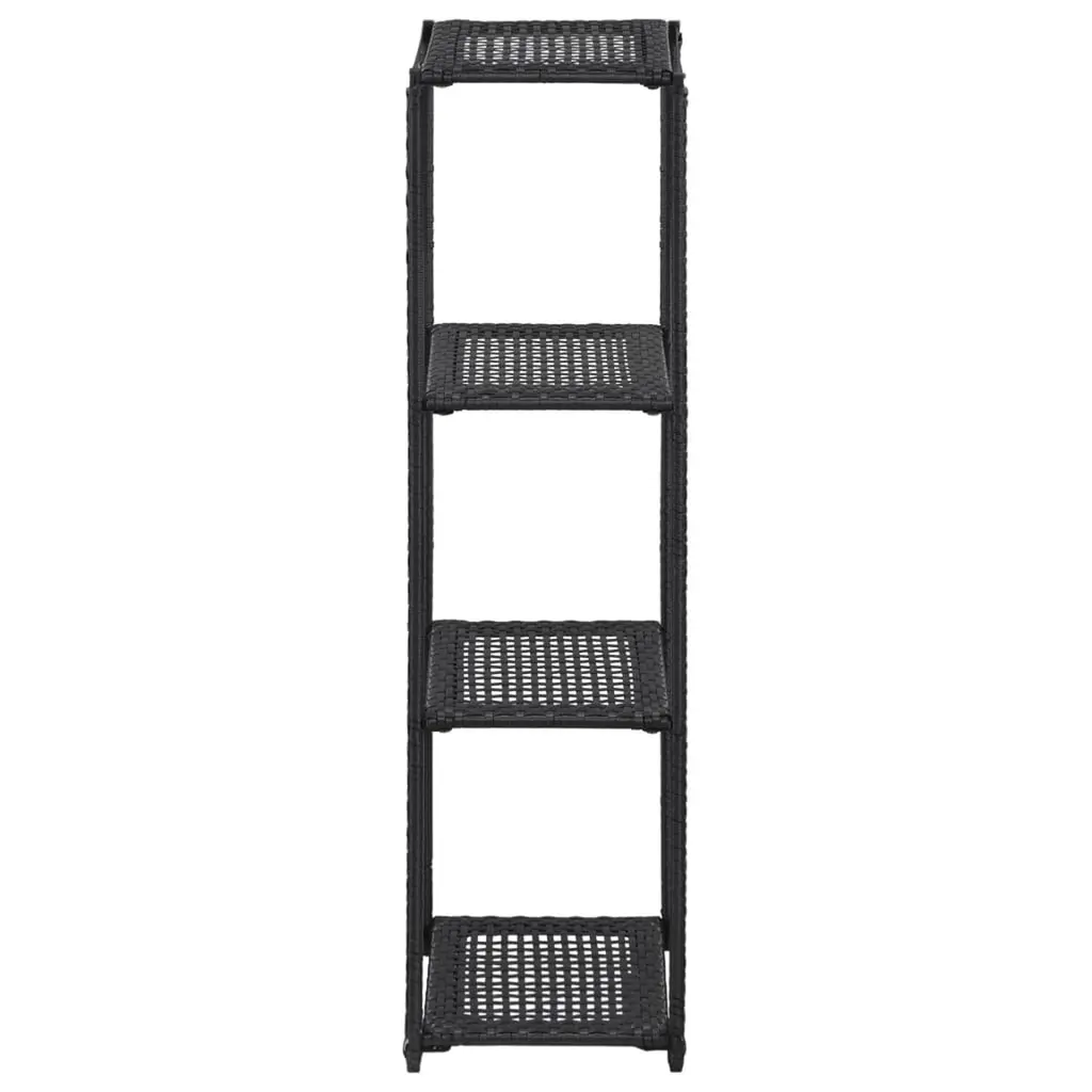 This 4-Tier Poly Rattan Storage Shelf is a stylish solution designed for both functionality and aesthetics, seamlessly fitting into modern interiors and exteriors. Crafted from sturdy poly rattan, its sleek black finish adds a touch of elegance, making it ideal for displaying plants, books, or decorative items in various rooms including the kitchen, living room, and workshops. Ample Storage: With four spacious tiers, this storage shelf provides excellent capacity to organize essentials, from books to display items, enhancing the efficiency of any space.Durable Material: Made from weather-resistant poly rattan, this shelf ensures longevity and resilience, great for showcasing your belongings whether inside or outside.Multi-Purpose Use: This versatile shelf can work as a plant stand, product display area, or a decorative piece, meeting various personal or professional storage needs.Sturdy Design: The item can be securely mounted to the wall to prevent tipping over, keeping it safe and stable, especially in homes with children or pets.Compact Size: Measuring 11.8x11.8x47.2 in, this tiered shelf is perfect for tight spaces while still delivering generous display and storage options.