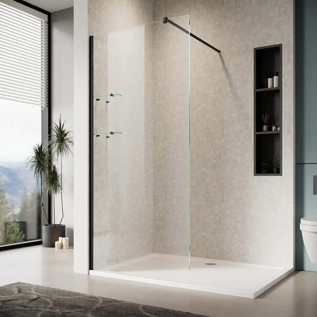 Bring a fresh appearance of aesthetics to your bathroom with our modern walk-in shower wall with a shelf!Good to know: