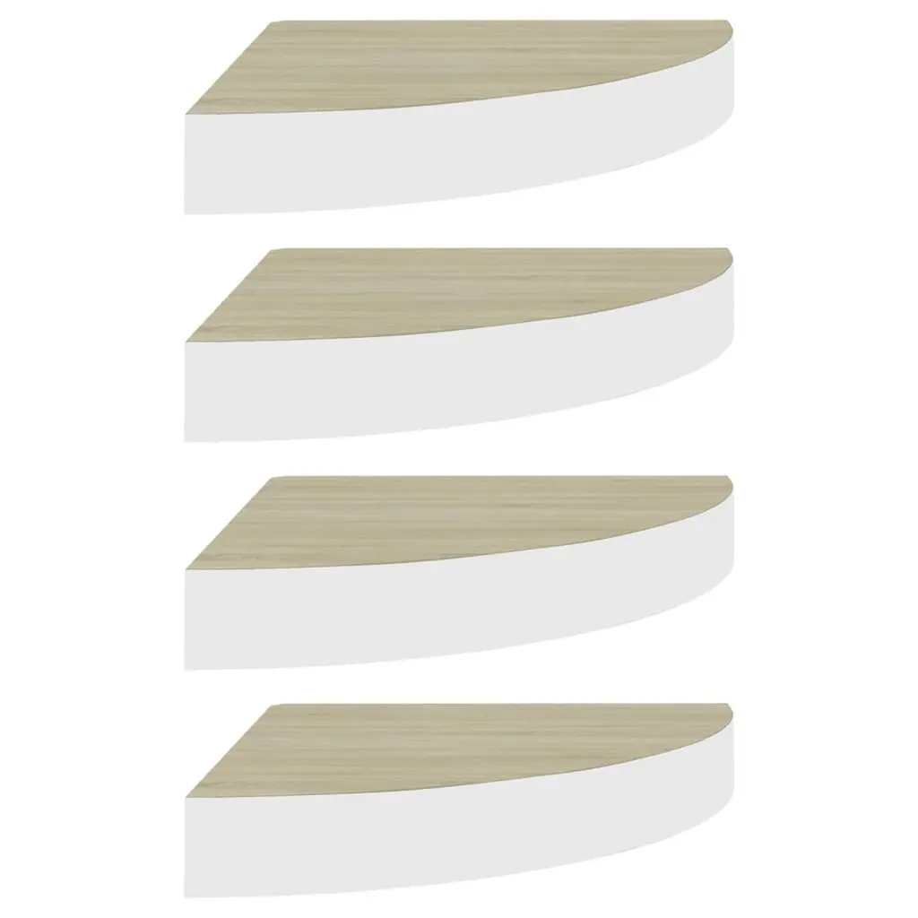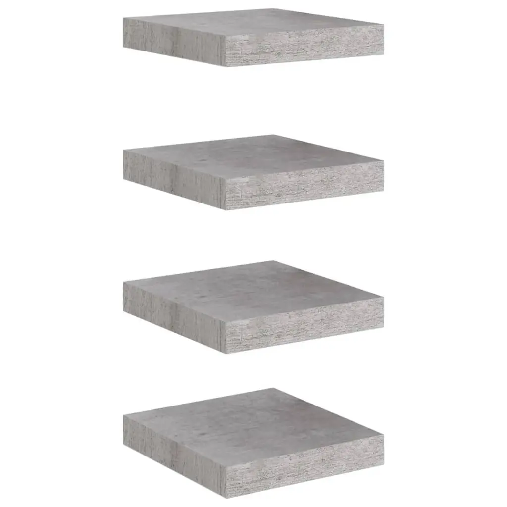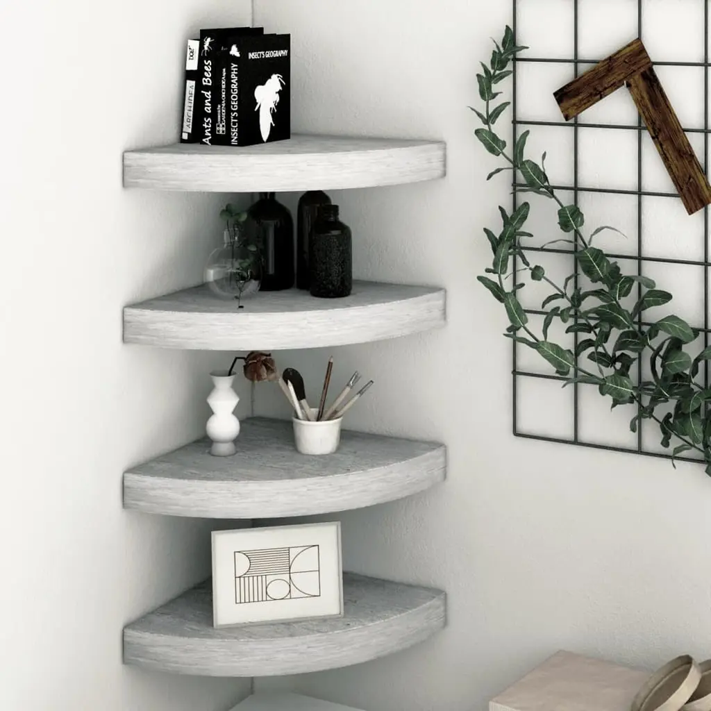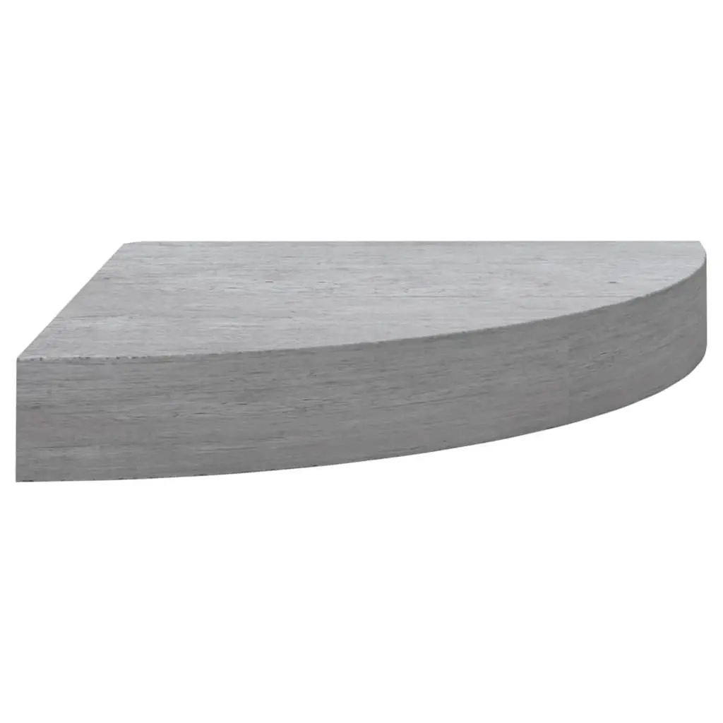 This set of four corner wall shelves is designed to make the most of your living area while adding some style to any room. With a sleek concrete grey finish and a modern triangular shape, these floating shelves are just what you need to show off decorative items, books, or plants. They’re ideal for living rooms, bedrooms, or offices. Space-Saving Design: The triangular shape of these shelves allows them to fit snugly into corners, perfect for utilizing otherwise wasted space and creating a cleaner look in your home.Durable Material: Each shelf is built from quality engineered MDF, providing strength and a stylish edge without compromise.Invisible Mounting: The clever mounting system hides the brackets, lending your walls a polished, tidy appearance while ensuring stability and easy installation.Versatile Use: Perfect for various rooms, these shelves can effortlessly hold books, plants, or decorative bits, adding flair and functionality to your space.Compact Size: Each shelf measures 9.8 in x 9.8 in and is 1.5 in thick, ideal for small spaces but strong enough to hold up to 11 lbs each.