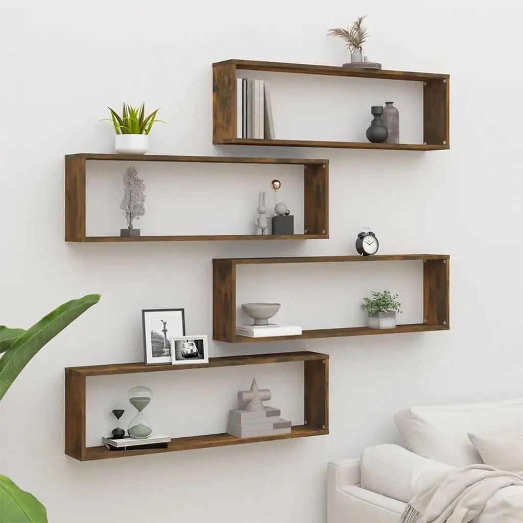 This 4-piece wall cube shelf set is all about blending practicality and style, bringing a modern vibe to any living space, bedroom, or office. Made from top-notch engineered wood and finished in a gorgeous smoked oak, these floating shelves offer a chic way to display your books, decor, and personal keepsakes while keeping everything neat and tidy. Versatile Storage: Perfect for small items; this shelf can fit in any room and is great for playing around with displays of books, trinkets, or decor to liven up your space.Quality Manufacturing: Made from top-quality engineered wood, this shelf is built to last, keeping your items safe. The smooth finish not only looks good but also makes it easy to keep clean.Easy to Install: The shelf mounts right to your wall, saving floor space and making it easy to put up. Comes with clear instructions to help you out, even if you’re no DIY expert.Ideal for Any Decor: The modern, minimal design fits right in with all sorts of styles, whether contemporary, traditional, or quirky. You can easily adjust it to suit your taste.Compact Dimensions: Each shelf is 39.4 in long, 5.9 in wide, and 11.8 in high, making them a handy choice for both small and big rooms without overwhelming your decor.