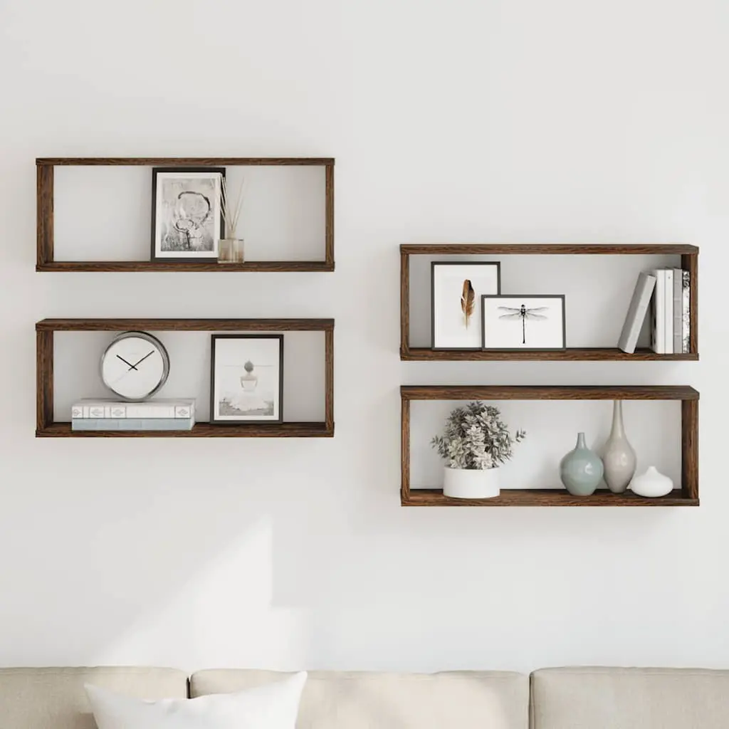 This set of wall-mounted cube shelves provides a stylish and functional solution for storage and display in your living room, bedroom, or any space in your home. Made from durable engineered wood, each shelf features a lovely smoked oak finish that enhances the modern look while offering versatile storage for books, decorative bits, and personal treasures. Each shelf measures 23.6 in in length, 5.9 in in width, and 9.1 in in height—perfect for tight spaces.Made from sturdy engineered wood, these shelves are built to hold a variety of lightweight items while looking great.With four shelves in the set, you can create a custom display arrangement that works for both storage and decor.The floating design gets rid of visible brackets, giving a seamless look that draws your eye to the items on display.Perfect for living rooms, bedrooms, or home offices, these shelves not only enhance storage but also showcase your favorite decor or books.