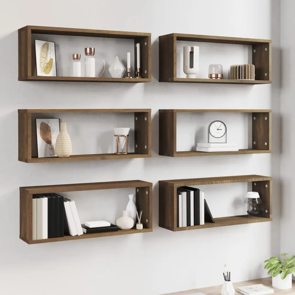 This wall cube shelf set is a sleek storage solution that fits perfectly into any modern home. With six cube compartments, these wooden shelves offer a stylish way to show off books, decor, or personal treasures while keeping everything neat and visually appealing. Stylish Contemporary Design: The brown oak finish adds warmth and character to your living room or bedroom, making it a standout feature.Ample Storage Space: Perfect for showing off decor or storing books, helping keep your space tidy.Durable Engineered Wood: Made from sturdy engineered wood, these shelves are built to handle everyday use while looking smart over time.Space-Saving Wall-Mounted Features: Mounting them on the wall maximizes your floor space, ideal for smaller rooms or apartments.Versatile Use: Perfect for indoors, these shelves work well in the living room, bedroom, or study, boosting functionality.