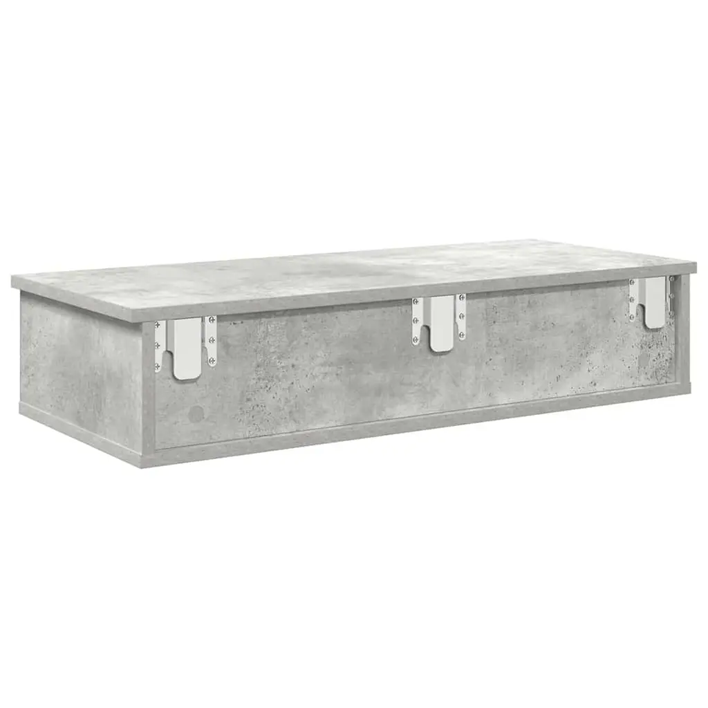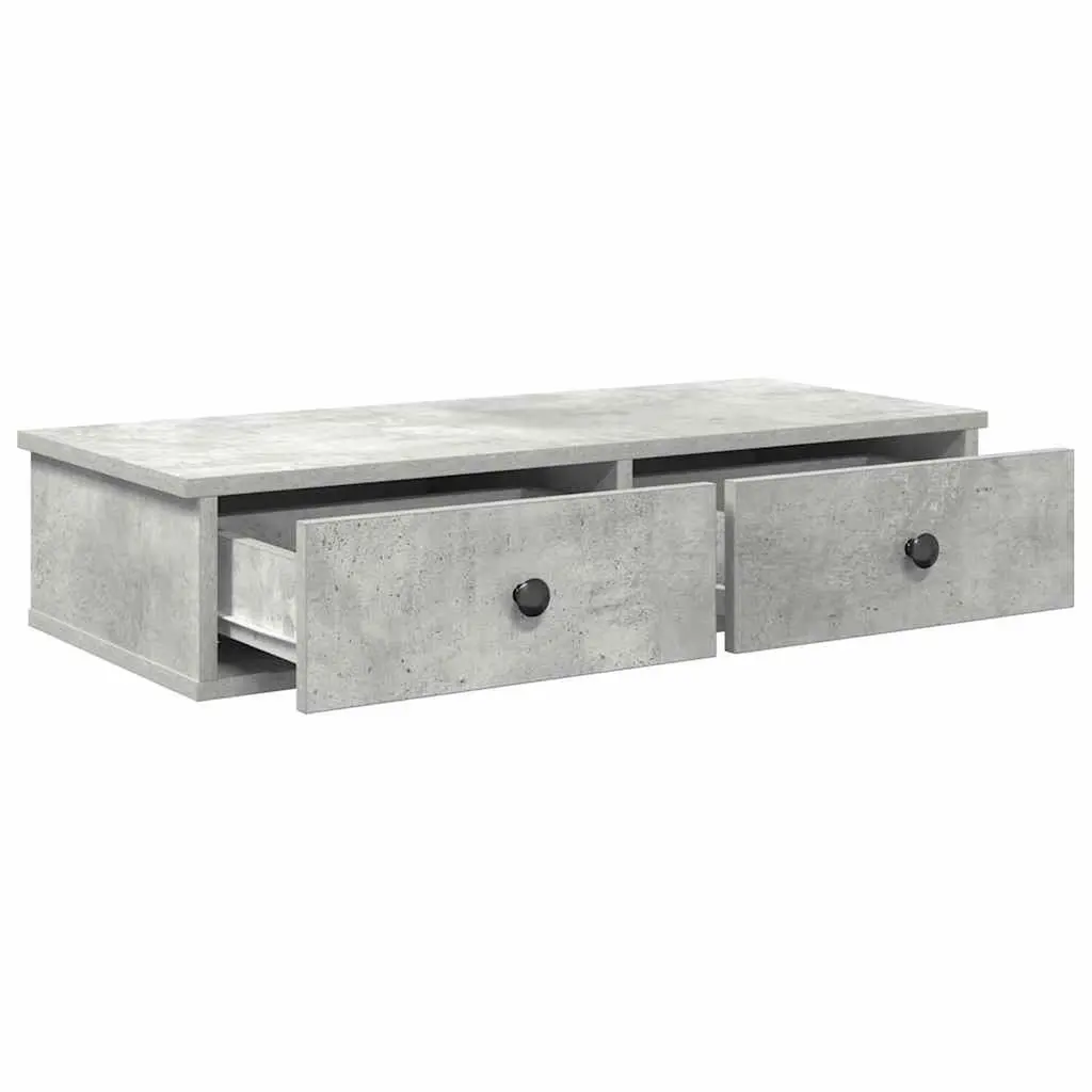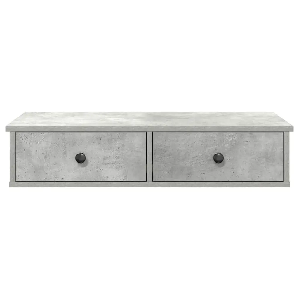 This concrete grey floating wall shelf with drawers is a great way to maximize storage while keeping things modern and tidy. It’s perfect for any room, like living rooms or bedrooms, and has a minimalist design that adds to the contemporary vibe, turning your wall into a stylish storage spot. Space-Saving Design: A smart space-saving solution, this wall shelf mounts right to your wall for a floating effect. With no visible brackets, it frees up valuable floor space and looks neat and tidy.Ample Storage: With two standard drawers and an open shelf, it creates loads of space for displaying decor or stashing essentials. This mix of drawer storage and shelf space is perfect for keeping things stylishly organized.Quality Material: Built from tough engineered wood, the smooth matte finish not only looks great but stands up well to daily use. You can count on it for lasting performance in your home.Modern Aesthetic: The sleek concrete grey finish and clean lines capture modern design vibes, adding a contemporary twist to any room. It blends in easily with various interior styles.Easy Assembly: Designed for straightforward assembly, it comes with mounting points for easy setup, only needing a screwdriver to get started. You can enjoy your new shelf without any hassle.