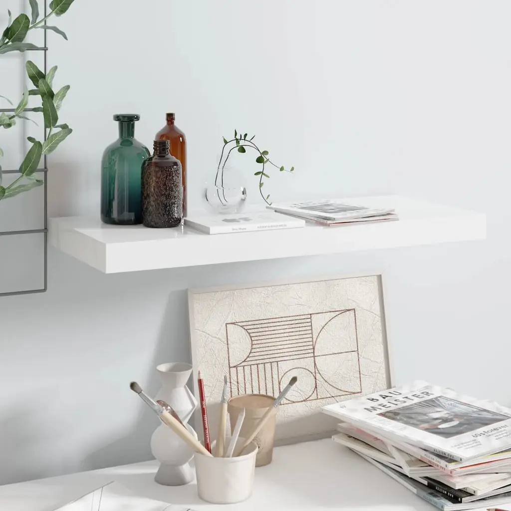 This floating wall shelf mixes modern vibes with practicality, offering a great way to show off your favorite books, ornaments, or photos. With its glossy white finish, this shelf enhances any room's look and is versatile enough for the living room, bedroom, or office. Stylish and Modern: The high gloss white finish makes this shelf really pop, giving it a sleek look that's perfect for any decor style.Easy to Clean: The glossy surface allows for a quick wipe-down, keeping it looking brand new.Weight Capacity: Can hold up to 15.4 lbs, making it sturdy enough for books, decorations, or photos.Compact Size: At 23.6 in long and 9.3 in wide, this shelf fits small spaces perfectly.Installation Included: Comes with all the hardware you need, so you can set it up quickly and easily.